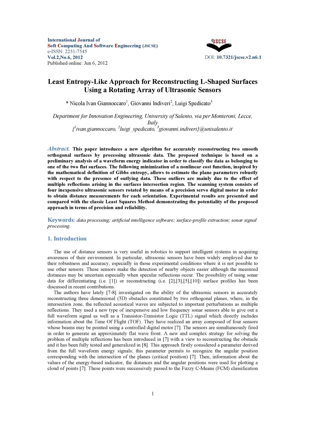 This paper introduces a new algorithm for accurately reconstructing two smooth orthogonal surfaces by processing ultrasonic data. The proposed technique is based on a preliminary analysis of a waveform energy indicator in order to classify the data as belonging to one of the two flat surfaces. The following minimization of a nonlinear cost function, inspired by the mathematical definition of Gibbs entropy, allows to estimate the plane parameters robustly with respect to the presence of outlying data. These outliers are mainly due to the effect of multiple reflections arising in the surfaces intersection region. The scanning system consists of four inexpensive ultrasonic sensors rotated by means of a precision servo digital motor in order to obtain distance measurements for each orientation. Experimental results are presented and compared with the classic Least Squares Method demonstrating the potentiality of the proposed approach in terms of precision and reliability.