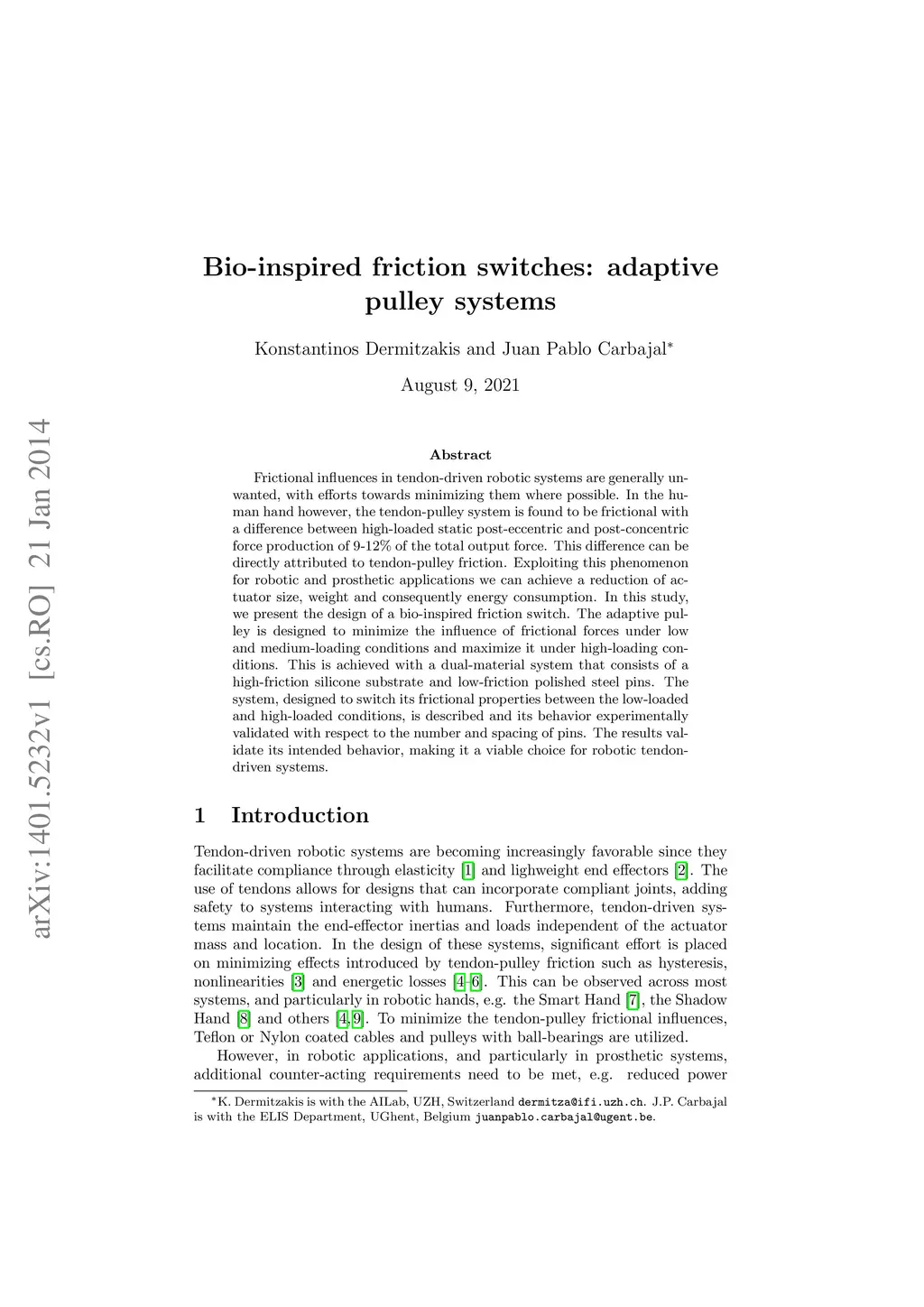 Frictional influences in tendon-driven robotic systems are generally unwanted, with efforts towards minimizing them where possible. In the human hand however, the tendon-pulley system is found to be frictional with a difference between high-loaded static post-eccentric and post-concentric force production of 9-12% of the total output force. This difference can be directly attributed to tendon-pulley friction. Exploiting this phenomenon for robotic and prosthetic applications we can achieve a reduction of actuator size, weight and consequently energy consumption. In this study, we present the design of a bio-inspired friction switch. The adaptive pulley is designed to minimize the influence of frictional forces under low and medium-loading conditions and maximize it under high-loading conditions. This is achieved with a dual-material system that consists of a high-friction silicone substrate and low-friction polished steel pins. The system, designed to switch its frictional properties between the low-loaded and high-loaded conditions, is described and its behavior experimentally validated with respect to the number and spacing of pins. The results validate its intended behavior, making it a viable choice for robotic tendon-driven systems.