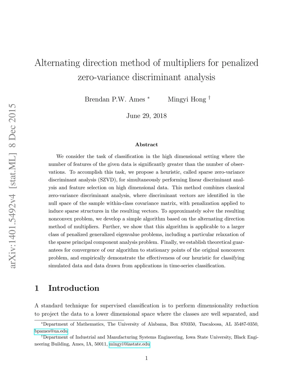 We consider the task of classification in the high dimensional setting where the number of features of the given data is significantly greater than the number of observations. To accomplish this task, we propose a heuristic, called sparse zero-variance discriminant analysis (SZVD), for simultaneously performing linear discriminant analysis and feature selection on high dimensional data. This method combines classical zero-variance discriminant analysis, where discriminant vectors are identified in the null space of the sample within-class covariance matrix, with penalization applied to induce sparse structures in the resulting vectors. To approximately solve the resulting nonconvex problem, we develop a simple algorithm based on the alternating direction method of multipliers. Further, we show that this algorithm is applicable to a larger class of penalized generalized eigenvalue problems, including a particular relaxation of the sparse principal component analysis problem. Finally, we establish theoretical guarantees for convergence of our algorithm to stationary points of the original nonconvex problem, and empirically demonstrate the effectiveness of our heuristic for classifying simulated data and data drawn from applications in time-series classification.