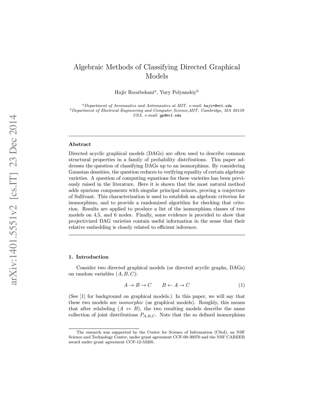 Directed acyclic graphical models (DAGs) are often used to describe common structural properties in a family of probability distributions. This paper addresses the question of classifying DAGs up to an isomorphism. By considering Gaussian densities, the question reduces to verifying equality of certain algebraic varieties. A question of computing equations for these varieties has been previously raised in the literature. Here it is shown that the most natural method adds spurious components with singular principal minors, proving a conjecture of Sullivant. This characterization is used to establish an algebraic criterion for isomorphism, and to provide a randomized algorithm for checking that criterion. Results are applied to produce a list of the isomorphism classes of tree models on 4,5, and 6 nodes. Finally, some evidence is provided to show that projectivized DAG varieties contain useful information in the sense that their relative embedding is closely related to efficient inference.