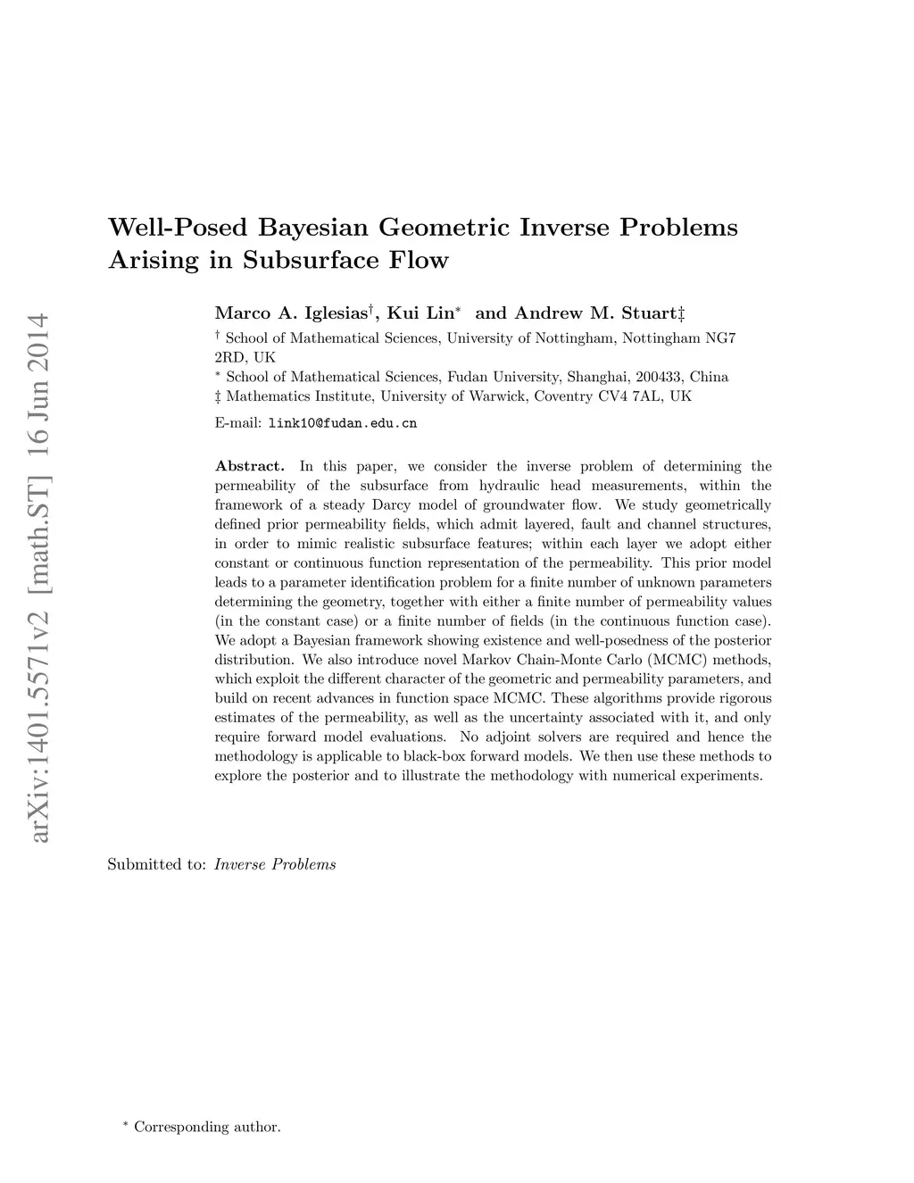 In this paper, we consider the inverse problem of determining the permeability of the subsurface from hydraulic head measurements, within the framework of a steady Darcy model of groundwater flow. We study geometrically defined prior permeability fields, which admit layered, fault and channel structures, in order to mimic realistic subsurface features; within each layer we adopt either constant or continuous function representation of the permeability. This prior model leads to a parameter identification problem for a finite number of unknown parameters determining the geometry, together with either a finite number of permeability values (in the constant case) or a finite number of fields (in the continuous function case). We adopt a Bayesian framework showing existence and well-posedness of the posterior distribution. We also introduce novel Markov Chain-Monte Carlo (MCMC) methods, which exploit the different character of the geometric and permeability parameters, and build on recent advances in function space MCMC. These algorithms provide rigorous estimates of the permeability, as well as the uncertainty associated with it, and only require forward model evaluations. No adjoint solvers are required and hence the methodology is applicable to black-box forward models. We then use these methods to explore the posterior and to illustrate the methodology with numerical experiments.