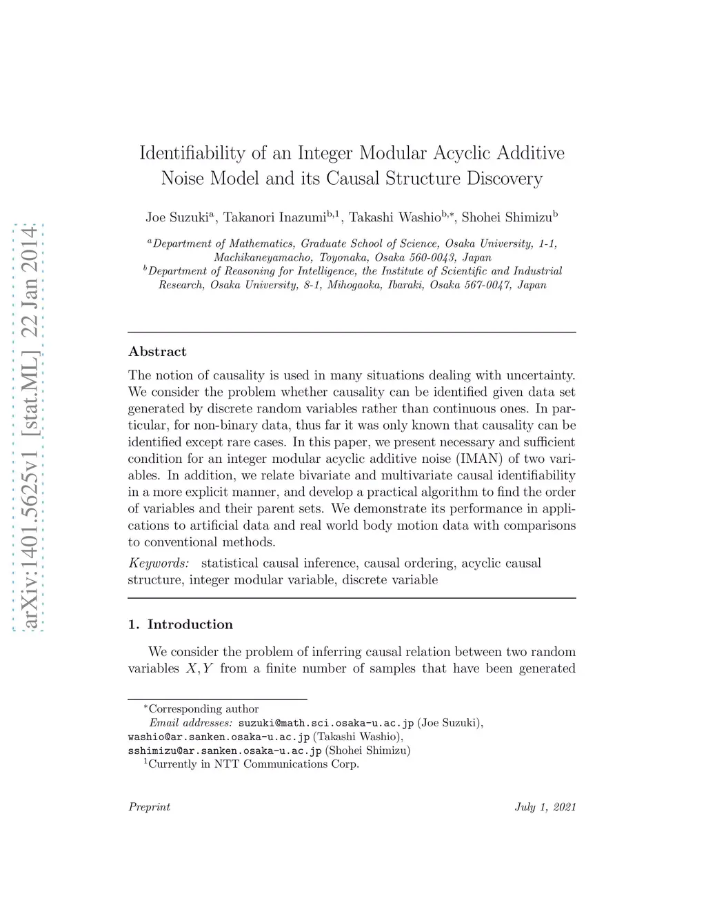 The notion of causality is used in many situations dealing with uncertainty. We consider the problem whether causality can be identified given data set generated by discrete random variables rather than continuous ones. In particular, for non-binary data, thus far it was only known that causality can be identified except rare cases. In this paper, we present necessary and sufficient condition for an integer modular acyclic additive noise (IMAN) of two variables. In addition, we relate bivariate and multivariate causal identifiability in a more explicit manner, and develop a practical algorithm to find the order of variables and their parent sets. We demonstrate its performance in applications to artificial data and real world body motion data with comparisons to conventional methods.