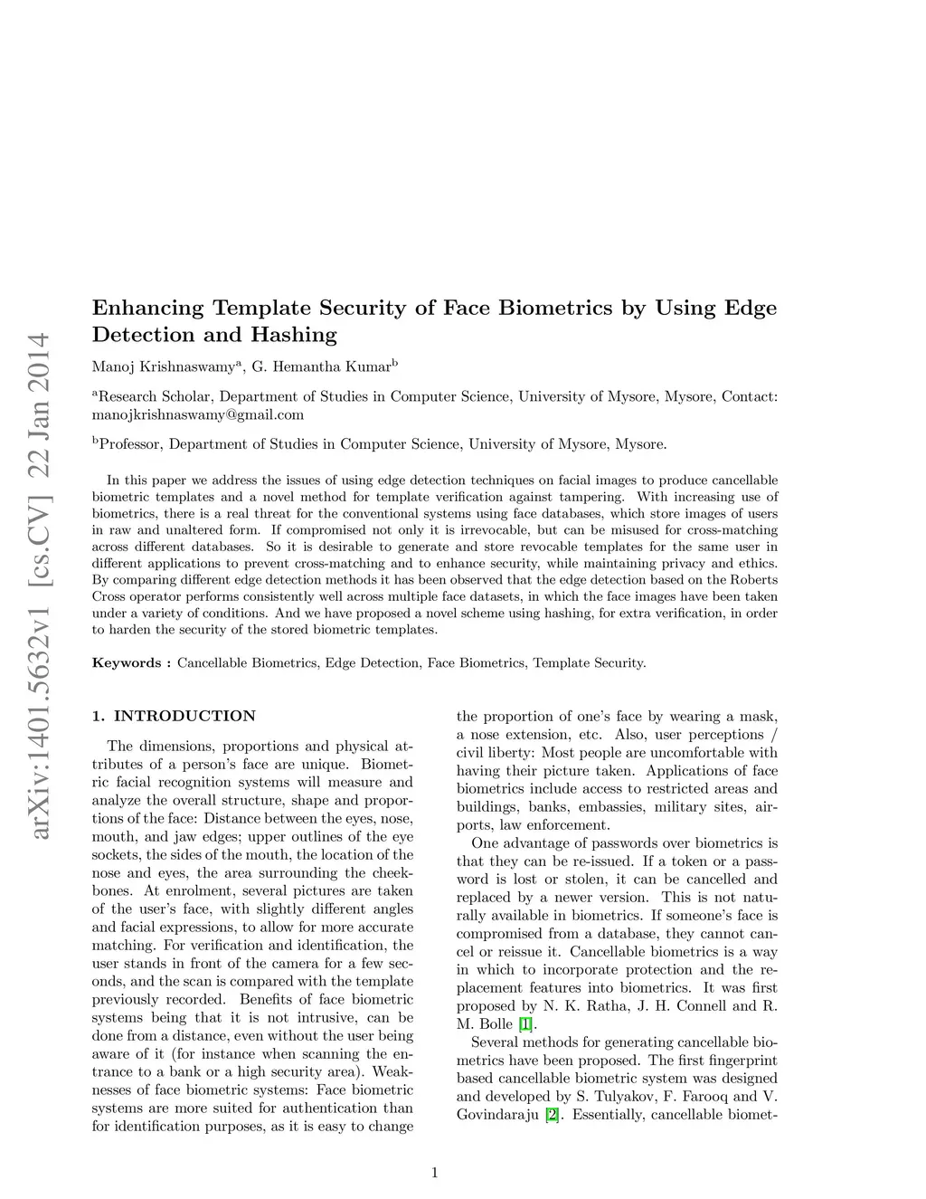 In this paper we address the issues of using edge detection techniques on facial images to produce cancellable biometric templates and a novel method for template verification against tampering. With increasing use of biometrics, there is a real threat for the conventional systems using face databases, which store images of users in raw and unaltered form. If compromised not only it is irrevocable, but can be misused for cross-matching across different databases. So it is desirable to generate and store revocable templates for the same user in different applications to prevent cross-matching and to enhance security, while maintaining privacy and ethics. By comparing different edge detection methods it has been observed that the edge detection based on the Roberts Cross operator performs consistently well across multiple face datasets, in which the face images have been taken under a variety of conditions. We have proposed a novel scheme using hashing, for extra verification, in order to harden the security of the stored biometric templates.