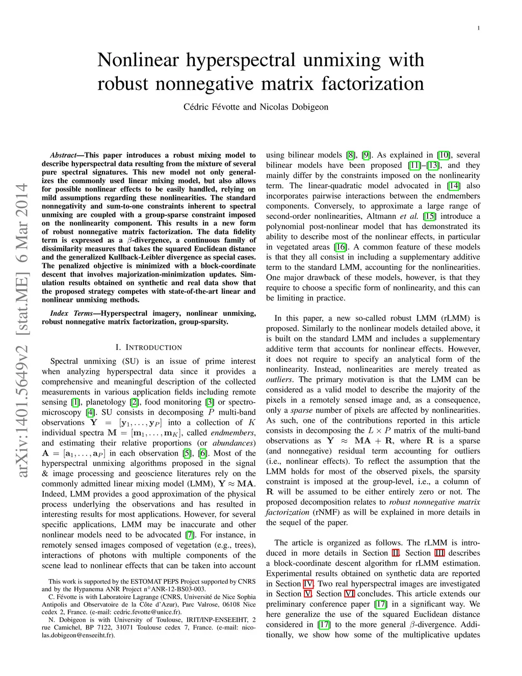 This paper introduces a robust mixing model to describe hyperspectral data resulting from the mixture of several pure spectral signatures. This new model not only generalizes the commonly used linear mixing model, but also allows for possible nonlinear effects to be easily handled, relying on mild assumptions regarding these nonlinearities. The standard nonnegativity and sum-to-one constraints inherent to spectral unmixing are coupled with a group-sparse constraint imposed on the nonlinearity component. This results in a new form of robust nonnegative matrix factorization. The data fidelity term is expressed as a ?-divergence, a continuous family of dissimilarity measures that takes the squared Euclidean distance and the generalized Kullback-Leibler divergence as special cases. The penalized objective is minimized with a block-coordinate descent that involves majorizationminimization updates. Simulation results obtained on synthetic and real data show that the proposed strategy competes with state-of-the-art linear and nonlinear unmixing methods.