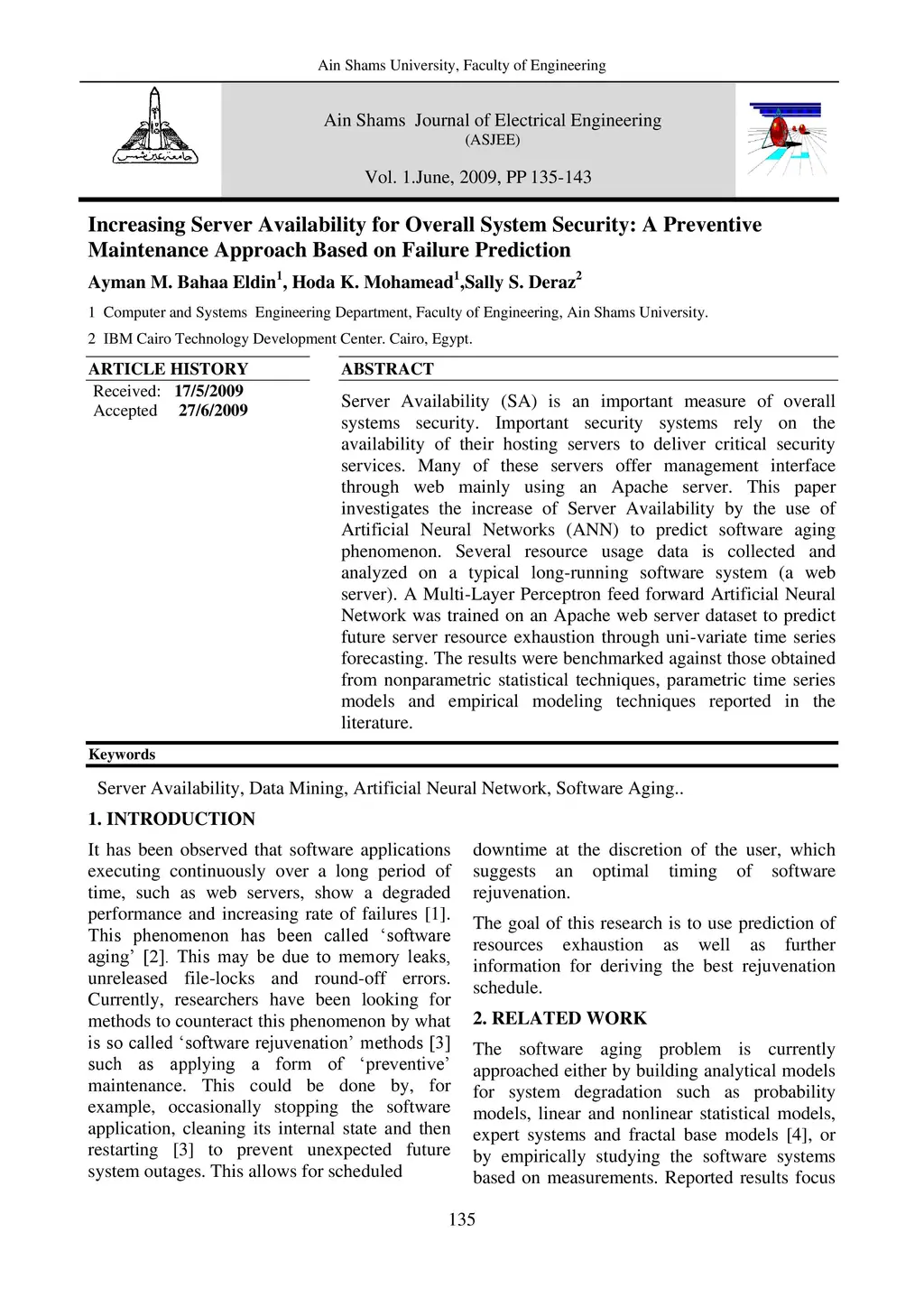 Server Availability (SA) is an important measure of overall systems security. Important security systems rely on the availability of their hosting servers to deliver critical security services. Many of these servers offer management interface through web mainly using an Apache server. This paper investigates the increase of Server Availability by the use of Artificial Neural Networks (ANN) to predict software aging phenomenon. Several resource usage data is collected and analyzed on a typical long-running software system (a web server). A Multi-Layer Perceptron feed forward Artificial Neural Network was trained on an Apache web server data-set to predict future server resource exhaustion through uni-variate time series forecasting. The results were benchmarked against those obtained from non-parametric statistical techniques, parametric time series models and empirical modeling techniques reported in the literature.