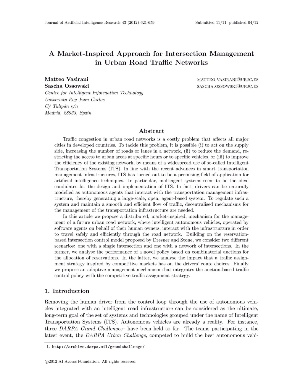 Traffic congestion in urban road networks is a costly problem that affects all major cities in developed countries. To tackle this problem, it is possible (i) to act on the supply side, increasing the number of roads or lanes in a network, (ii) to reduce the demand, restricting the access to urban areas at specific hours or to specific vehicles, or (iii) to improve the efficiency of the existing network, by means of a widespread use of so-called Intelligent Transportation Systems (ITS). In line with the recent advances in smart transportation management infrastructures, ITS has turned out to be a promising field of application for artificial intelligence techniques. In particular, multiagent systems seem to be the ideal candidates for the design and implementation of ITS. In fact, drivers can be naturally modelled as autonomous agents that interact with the transportation management infrastructure, thereby generating a large-scale, open, agent-based system. To regulate such a system and maintain a smooth and efficient flow of traffic, decentralised mechanisms for the management of the transportation infrastructure are needed. In this article we propose a distributed, market-inspired, mechanism for the management of a future urban road network, where intelligent autonomous vehicles, operated by software agents on behalf of their human owners, interact with the infrastructure in order to travel safely and efficiently through the road network. Building on the reservation-based intersection control model proposed by Dresner and Stone, we consider two different scenarios: one with a single intersection and one with a network of intersections. In the former, we analyse the performance of a novel policy based on combinatorial auctions for the allocation of reservations. In the latter, we analyse the impact that a traffic assignment strategy inspired by competitive markets has on the drivers route choices. Finally we propose an adaptive management mechanism that integrates the auction-based traffic control policy with the competitive traffic assignment strategy.