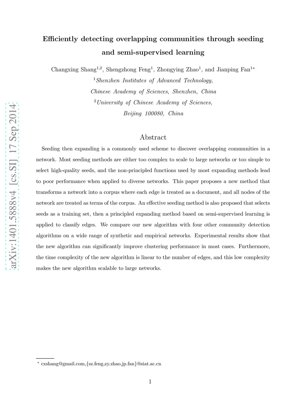 Seeding then expanding is a commonly used scheme to discover overlapping communities in a network. Most seeding methods are either too complex to scale to large networks or too simple to select high-quality seeds, and the non-principled functions used by most expanding methods lead to poor performance when applied to diverse networks. This paper proposes a new method that transforms a network into a corpus where each edge is treated as a document, and all nodes of the network are treated as terms of the corpus. An effective seeding method is also proposed that selects seeds as a training set, then a principled expanding method based on semi-supervised learning is applied to classify edges. We compare our new algorithm with four other community detection algorithms on a wide range of synthetic and empirical networks. Experimental results show that the new algorithm can significantly improve clustering performance in most cases. Furthermore, the time complexity of the new algorithm is linear to the number of edges, and this low complexity makes the new algorithm scalable to large networks.