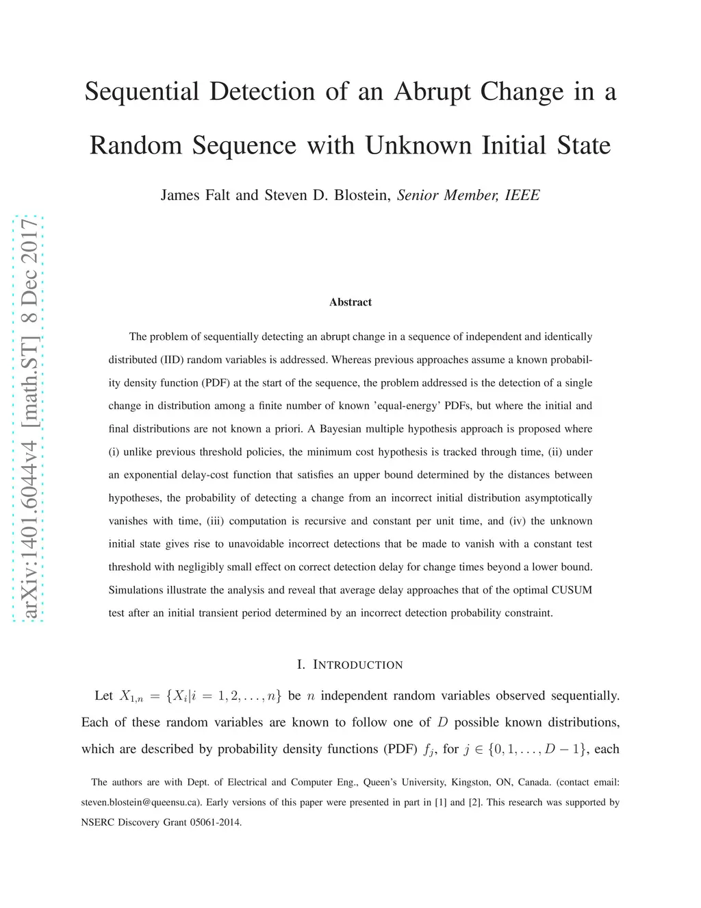 The problem of sequentially detecting an abrupt change in a sequence of independent and identically distributed (IID) random variables is addressed. Whereas previous approaches assume a known probability density function (PDF) at the start of the sequence, the problem addressed is the detection of a single change in distribution among a finite number of known équal-energy' PDFs, but where the initial and final distributions are not known a priori. A Bayesian multiple hypothesis approach is proposed where (i) unlike previous threshold policies, the minimum cost hypothesis is tracked through time, (ii) under an exponential delay-cost function that satisfies an upper bound determined by the distances between hypotheses, the probability of detecting a change from an incorrect initial distribution asymptotically vanishes with time, (iii) computation is recursive and constant per unit time, and (iv) the unknown initial state gives rise to unavoidable incorrect detections that be made to vanish with a constant test threshold with negligibly small effect on correct detection delay for change times beyond a lower bound. Simulations illustrate the analysis and reveal that average delay approaches that of the optimal CUSUM test after an initial transient period determined by an incorrect detection probability constraint.