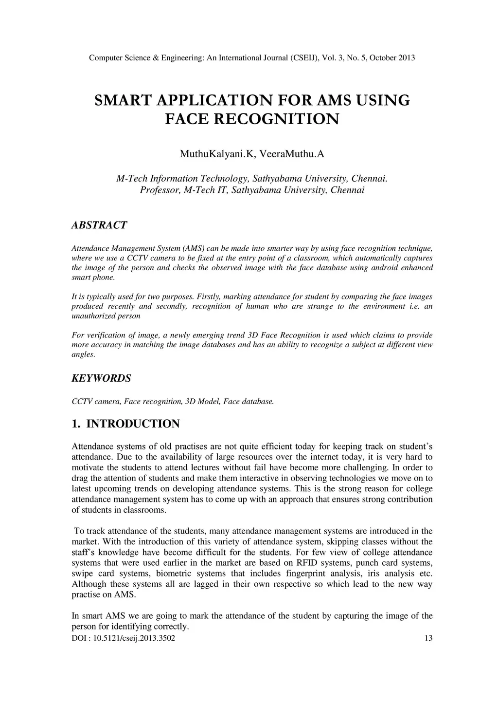 Attendance Management System (AMS) can be made into smarter way by using face recognition technique, where we use a CCTV camera to be fixed at the entry point of a classroom, which automatically captures the image of the person and checks the observed image with the face database using android enhanced smart phone. It is typically used for two purposes. Firstly, marking attendance for student by comparing the face images produced recently and secondly, recognition of human who are strange to the environment i.e. an unauthorized person For verification of image, a newly emerging trend 3D Face Recognition is used which claims to provide more accuracy in matching the image databases and has an ability to recognize a subject at different view angles.