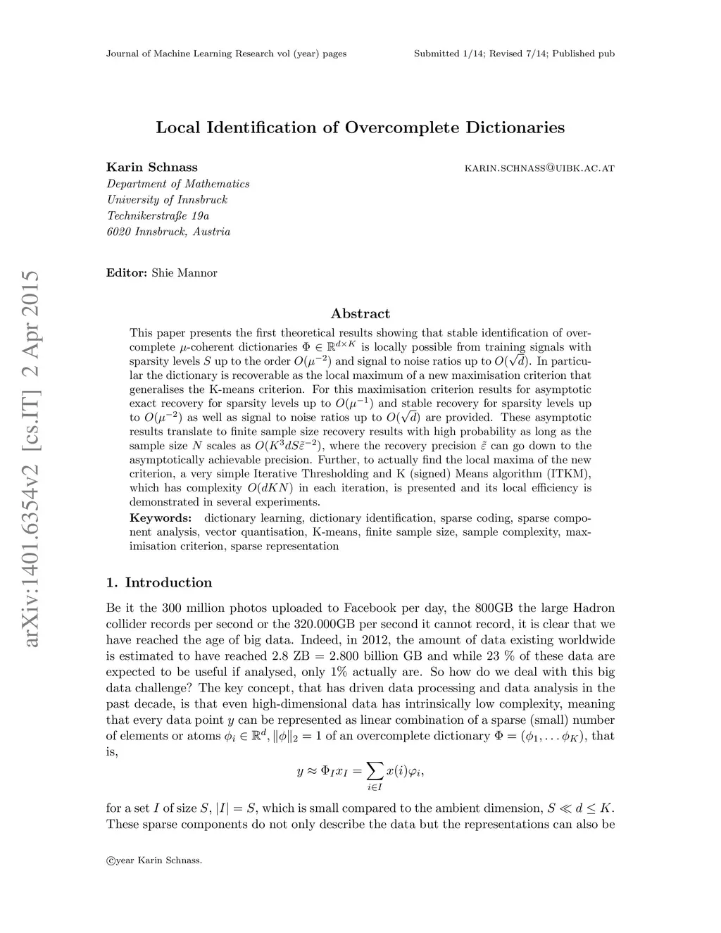 This paper presents the first theoretical results showing that stable identification of overcomplete -coherent dictionaries is locally possible from training signals with sparsity levels up to the order and signal to noise ratios up to . In particular the dictionary is recoverable as the local maximum of a new maximisation criterion that generalises the K-means criterion. For this maximisation criterion results for asymptotic exact recovery for sparsity levels up to and stable recovery for sparsity levels up to as well as signal to noise ratios up to are provided. These asymptotic results translate to finite sample size recovery results with high probability as long as the sample size scales as , where the recovery precision can go down to the asymptotically achievable precision. Further, to actually find the local maxima of the new criterion, a very simple Iterative Thresholding and K (signed) Means algorithm (ITKM), which has complexity in each iteration, is presented and its local efficiency is demonstrated in several experiments.