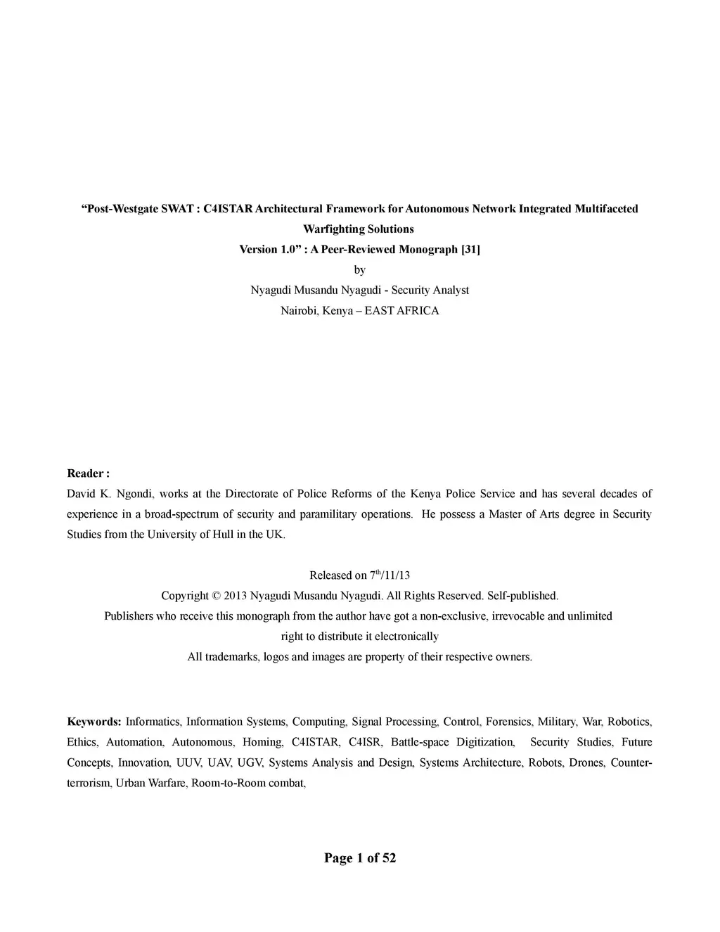 Police SWAT teams and Military Special Forces face mounting pressure and challenges from adversaries that can only be resolved by way of ever more sophisticated inputs into tactical operations. Lethal Autonomy provides constrained military/security forces with a viable option, but only if implementation has got proper empirically supported foundations. Autonomous weapon systems can be designed and developed to conduct ground, air and naval operations. This monograph offers some insights into the challenges of developing legal, reliable and ethical forms of autonomous weapons, that address the gap between Police or Law Enforcement and Military operations that is growing exponentially small. National adversaries are today in many instances hybrid threats, that manifest criminal and military traits, these often require deployment of hybrid-capability autonomous weapons imbued with the capability to taken on both Military and/or Security objectives. The Westgate Terrorist Attack of 21st September 2013 in the Westlands suburb of Nairobi, Kenya is a very clear manifestation of the hybrid combat scenario that required military response and police investigations against a fighting cell of the Somalia based globally networked Al Shabaab terrorist group.