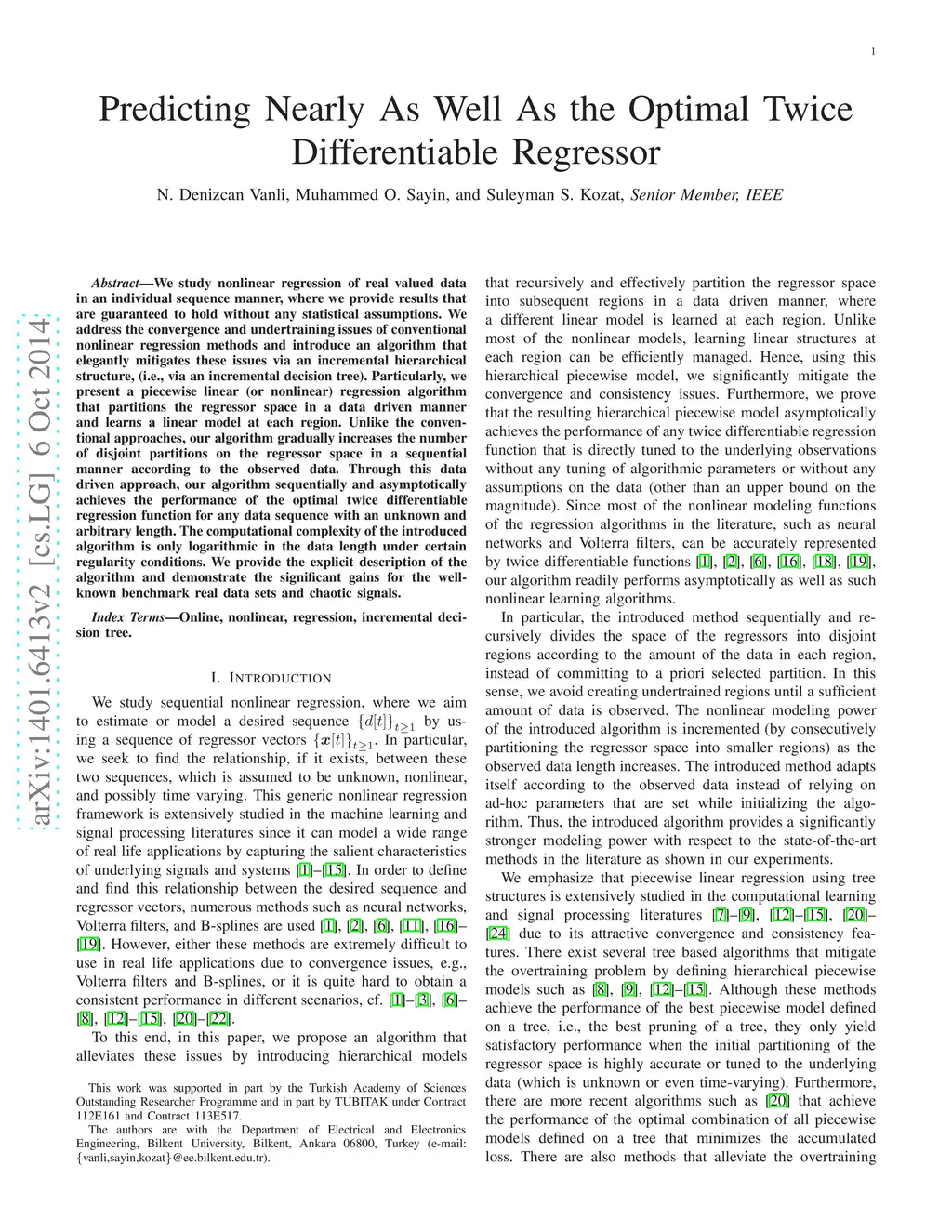 We study nonlinear regression of real valued data in an individual sequence manner, where we provide results that are guaranteed to hold without any statistical assumptions. We address the convergence and undertraining issues of conventional nonlinear regression methods and introduce an algorithm that elegantly mitigates these issues via an incremental hierarchical structure, (i.e., via an incremental decision tree). Particularly, we present a piecewise linear (or nonlinear) regression algorithm that partitions the regressor space in a data driven manner and learns a linear model at each region. Unlike the conventional approaches, our algorithm gradually increases the number of disjoint partitions on the regressor space in a sequential manner according to the observed data. Through this data driven approach, our algorithm sequentially and asymptotically achieves the performance of the optimal twice differentiable regression function for any data sequence with an unknown and arbitrary length. The computational complexity of the introduced algorithm is only logarithmic in the data length under certain regularity conditions. We provide the explicit description of the algorithm and demonstrate the significant gains for the well-known benchmark real data sets and chaotic signals.