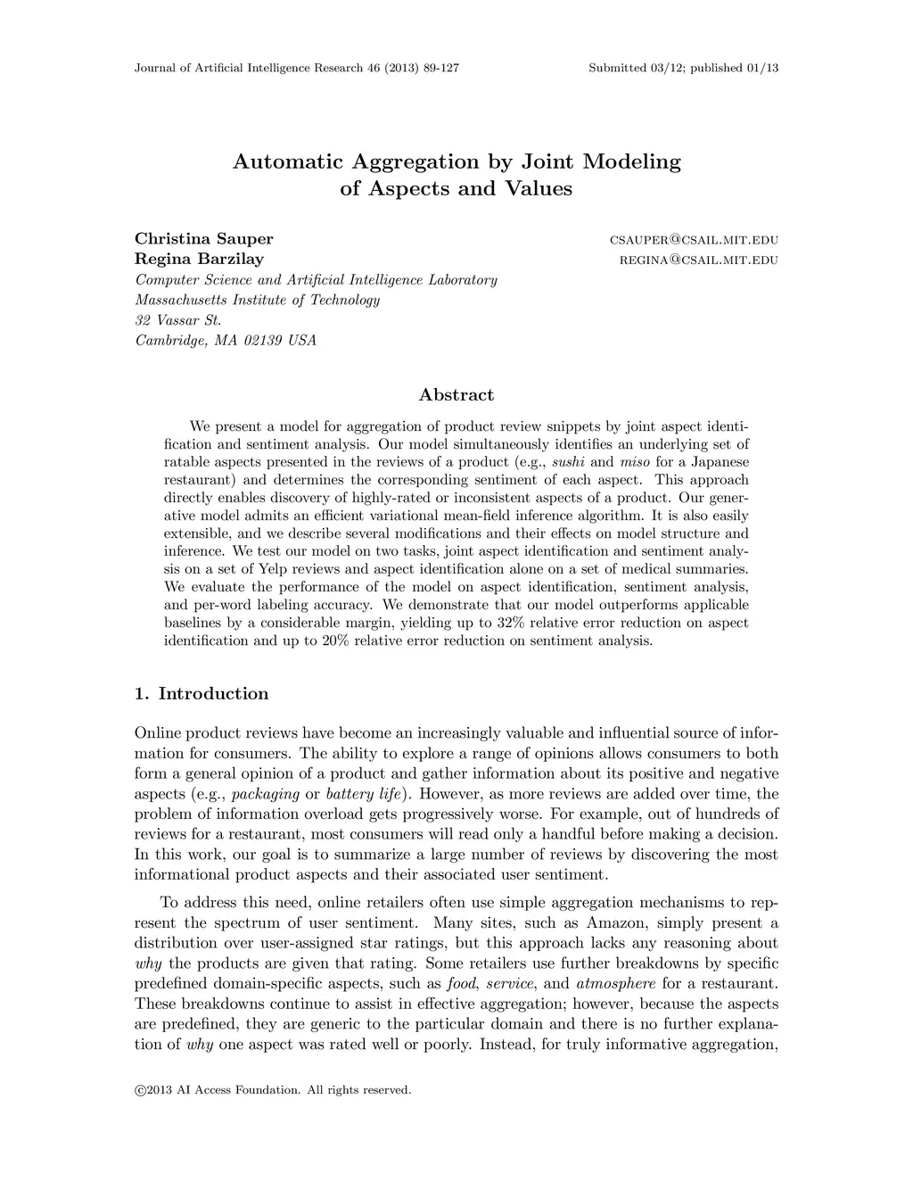 Automatic Aggregation by Joint Modeling of Aspects and Values