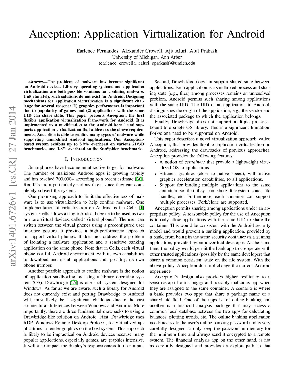 The problem of malware has become significant on Android devices. Library operating systems and application virtualization are both possible solutions for confining malware. Unfortunately, such solutions do not exist for Android. Designing mechanisms for application virtualization is a significant chal- lenge for several reasons: (1) graphics performance is important due to popularity of games and (2) applications with the same UID can share state. This paper presents Anception, the first flexible application virtualization framework for Android. It is imple- mented as a modification to the Android kernel and supports application virtualization that addresses the above requirements. Anception is able to confine many types of malware while supporting unmodified Android applications. Our Anception- based system exhibits up to 3.9% overhead on various 2D/3D benchmarks, and 1.8% overhead on the SunSpider benchmark.