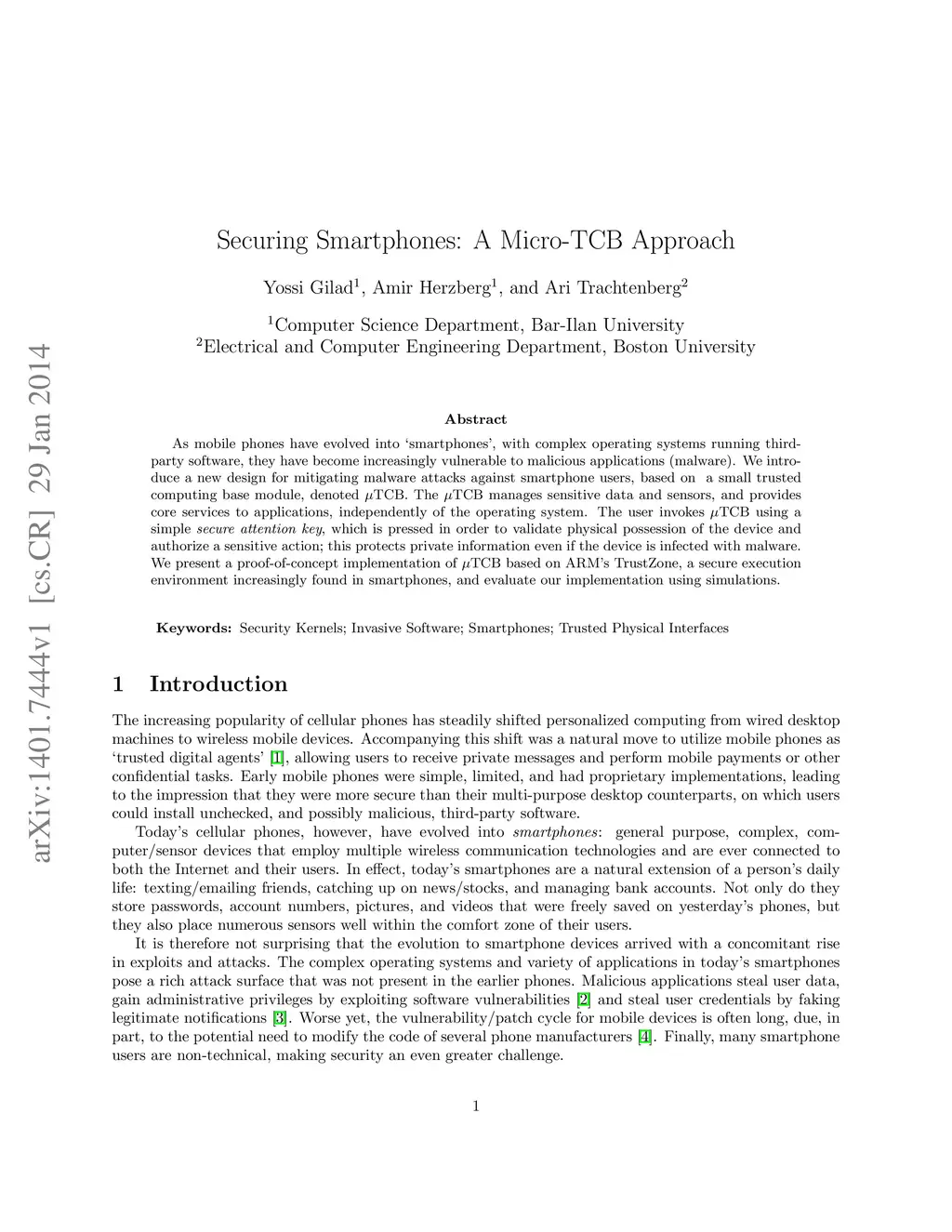 As mobile phones have evolved into `smartphones', with complex operating systems running third- party software, they have become increasingly vulnerable to malicious applications (malware). We introduce a new design for mitigating malware attacks against smartphone users, based on a small trusted computing base module, denoted uTCB. The uTCB manages sensitive data and sensors, and provides core services to applications, independently of the operating system. The user invokes uTCB using a simple secure attention key, which is pressed in order to validate physical possession of the device and authorize a sensitive action; this protects private information even if the device is infected with malware. We present a proof-of-concept implementation of uTCB based on ARM's TrustZone, a secure execution environment increasingly found in smartphones, and evaluate our implementation using simulations.