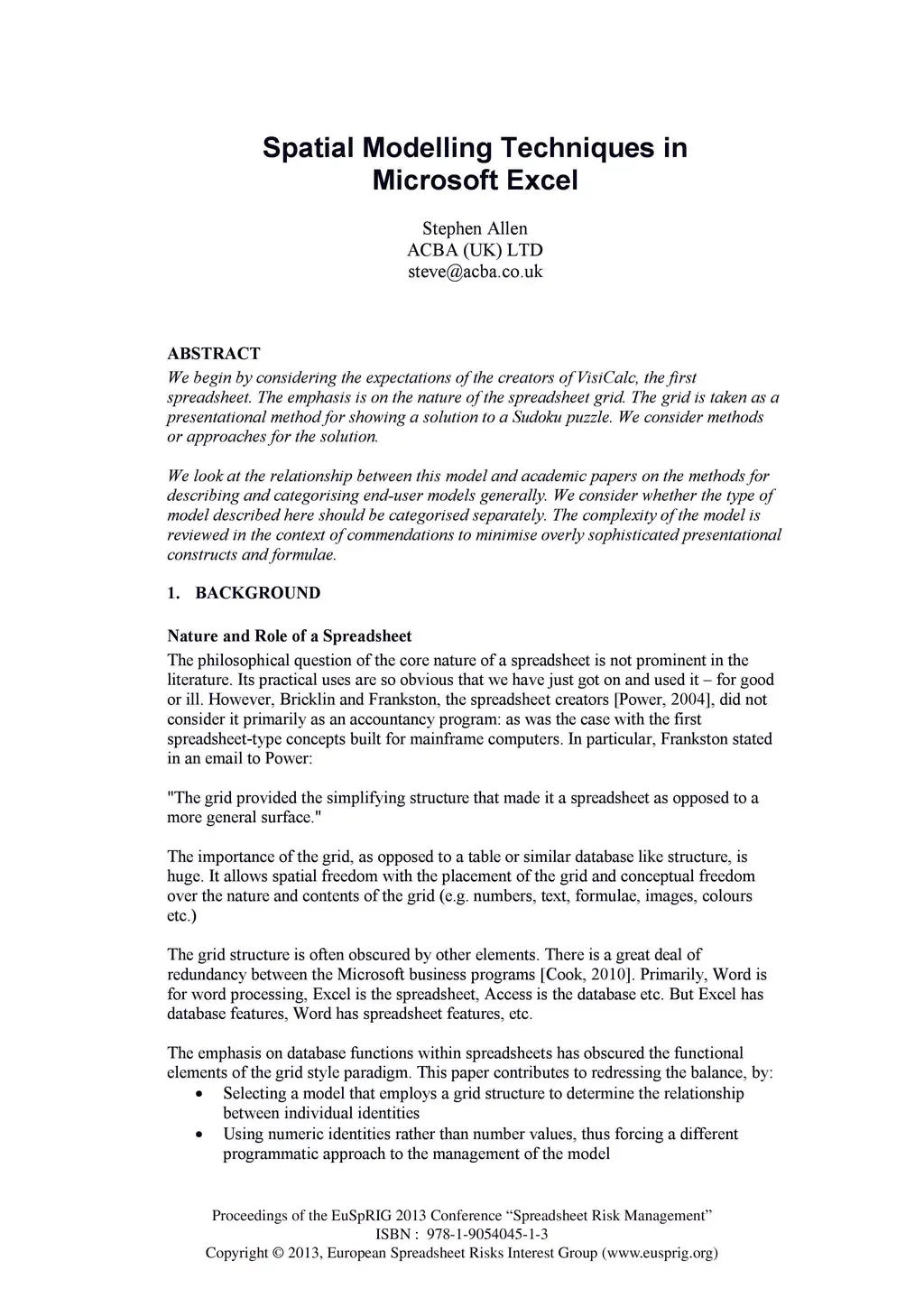 We begin by considering the expectations of the creators of VisiCalc, the first spreadsheet. The emphasis is on the nature of the spreadsheet grid. The grid is taken as a presentational method for showing a solution to a Sudoku puzzle. We consider methods or approaches for the solution. We look at the relationship between this model and academic papers on the methods for describing and categorising end-user models generally. We consider whether the type of model described here should be categorised separately. The complexity of the model is reviewed in the context of commendations to minimise overly sophisticated presentational constructs and formulae.