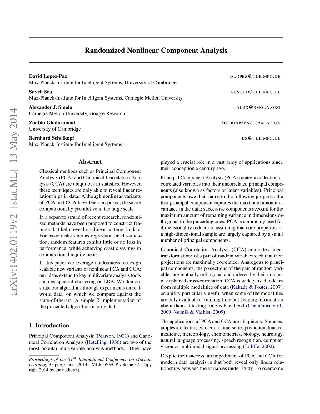 Classical methods such as Principal Component Analysis (PCA) and Canonical Correlation Analysis (CCA) are ubiquitous in statistics. However, these techniques are only able to reveal linear relationships in data. Although nonlinear variants of PCA and CCA have been proposed, these are computationally prohibitive in the large scale. In a separate strand of recent research, randomized methods have been proposed to construct features that help reveal nonlinear patterns in data. For basic tasks such as regression or classification, random features exhibit little or no loss in performance, while achieving drastic savings in computational requirements. In this paper we leverage randomness to design scalable new variants of nonlinear PCA and CCA; our ideas extend to key multivariate analysis tools such as spectral clustering or LDA. We demonstrate our algorithms through experiments on real-world data, on which we compare against the state-of-the-art. A simple R implementation of the presented algorithms is provided.