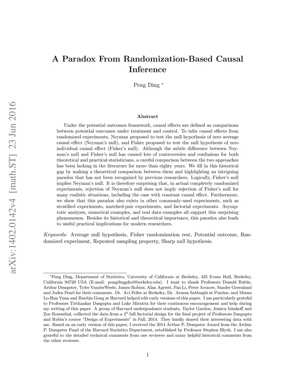 Under the potential outcomes framework, causal effects are defined as comparisons between potential outcomes under treatment and control. To infer causal effects from randomized experiments, Neyman proposed to test the null hypothesis of zero average causal effect (Neyman's null), and Fisher proposed to test the null hypothesis of zero individual causal effect (Fisher's null). Although the subtle difference between Neyman's null and Fisher's null has caused lots of controversies and confusions for both theoretical and practical statisticians, a careful comparison between the two approaches has been lacking in the literature for more than eighty years. We fill in this historical gap by making a theoretical comparison between them and highlighting an intriguing paradox that has not been recognized by previous researchers. Logically, Fisher's null implies Neyman's null. It is therefore surprising that, in actual completely randomized experiments, rejection of Neyman's null does not imply rejection of Fisher's null for many realistic situations, including the case with constant causal effect. Furthermore, we show that this paradox also exists in other commonly-used experiments, such as stratified experiments, matched-pair experiments, and factorial experiments. Asymptotic analyses, numerical examples, and real data examples all support this surprising phenomenon. Besides its historical and theoretical importance, this paradox also leads to useful practical implications for modern researchers.