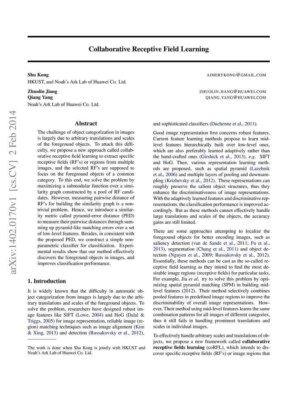 The challenge of object categorization in images is largely due to arbitrary translations and scales of the foreground objects. To attack this difficulty, we propose a new approach called collaborative receptive field learning to extract specific receptive fields (RF's) or regions from multiple images, and the selected RF's are supposed to focus on the foreground objects of a common category. To this end, we solve the problem by maximizing a submodular function over a similarity graph constructed by a pool of RF candidates. However, measuring pairwise distance of RF's for building the similarity graph is a nontrivial problem. Hence, we introduce a similarity metric called pyramid-error distance (PED) to measure their pairwise distances through summing up pyramid-like matching errors over a set of low-level features. Besides, in consistent with the proposed PED, we construct a simple nonparametric classifier for classification. Experimental results show that our method effectively discovers the foreground objects in images, and improves classification performance.