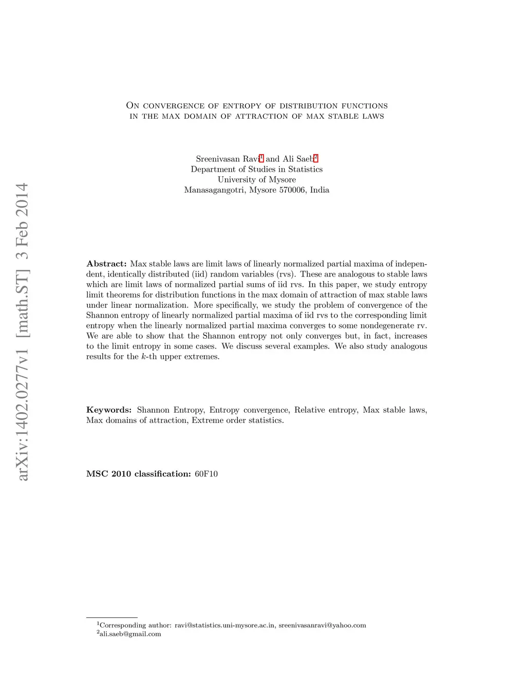 Max stable laws are limit laws of linearly normalized partial maxima of indepen- dent, identically distributed (iid) random variables (rvs). These are analogous to stable laws which are limit laws of normalized partial sums of iid rvs. In this paper, we study entropy limit theorems for distribution functions in the max domain of attraction of max stable laws under linear normalization. More specifically, we study the problem of convergence of the Shannon entropy of linearly normalized partial maxima of iid rvs to the corresponding limit entropy when the linearly normalized partial maxima converges to some nondegenerate rv. We are able to show that the Shannon entropy not only converges but, in fact, increases to the limit entropy in some cases. We discuss several examples. We also study analogous results for the k-th upper extremes.