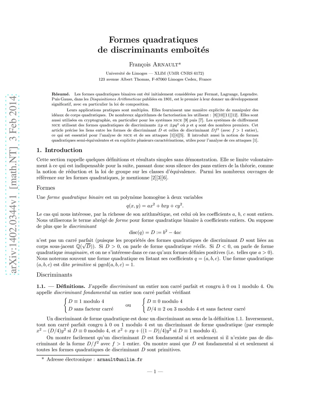 Quadratic forms with embedded discriminants. Integral binary quadratic forms have multiple applications, for example in factorization or cryptography. The Nice family of cryptographic systems makes use of quadratic forms with different discriminants , and where , are large primes. This paper shows the precise links between forms with discriminant and forms with discriminant, which are crucial in the analysis of the systems Nice and theirs attacks. We also introduce the notion of semi-equivalence of binary quadratic forms, and give some characterizations of semi-equivalent forms, which are useful in the analysis of these attacks. ----- Les formes quadratiques binaires fournissent un moyen explicite pour manipuler des id\éaux de corps quadratiques, et leurs applications pratiques sont multiples. De nombreux algorithmes de factorisation les utilisent. Elle sont aussi utilis\ées en cryptographie, en particulier pour les syst\`emes Nice. Les syst\`emes de chiffrement Nice utilisent des formes quadratiques de discriminants et o\`u et sont des nombres premiers. Cet article pr\écise les liens entre les formes de discriminant et celles de discriminant , ce qui est essentiel pour lánalyse de Nice et de ses attaques. Il introduit aussi la notion de formes quadratiques semi-\équivalentes et en explicite plusieurs caract\érisations, utiles pour lánalyse de ces attaques.