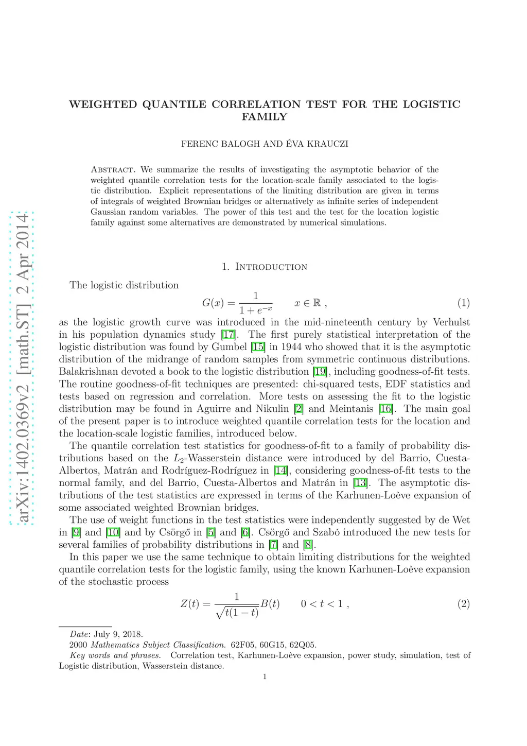 We summarize the results of investigating the asymptotic behavior of the weighted quantile correlation tests for the location-scale family associated to the logistic distribution. Explicit representations of the limiting distribution are given in terms of integrals of weighted Brownian bridges or alternatively as infinite series of independent Gaussian random variables. The power of this test and the test for the location logistic family against some alternatives are demonstrated by numerical simulations.