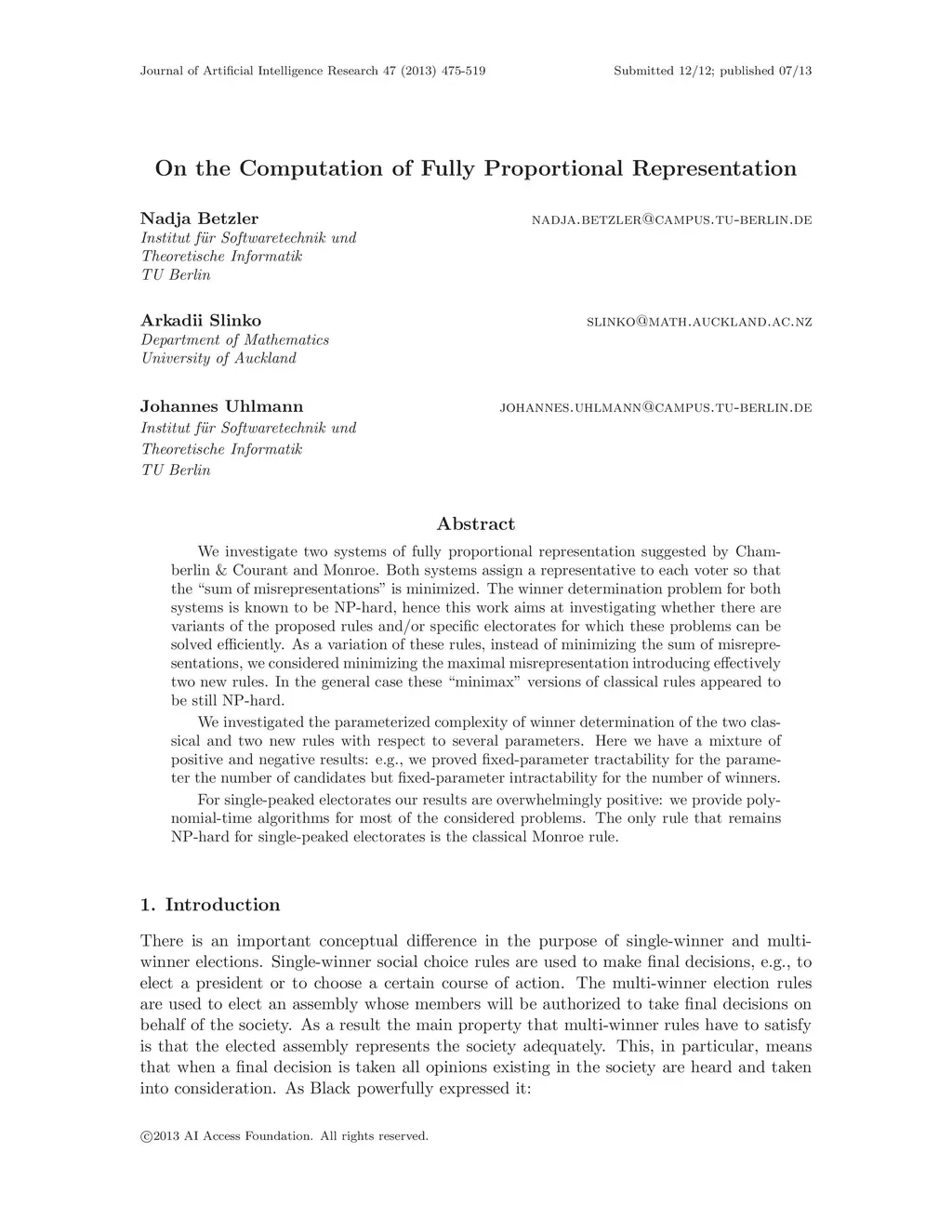 We investigate two systems of fully proportional representation suggested by Chamberlin Courant and Monroe. Both systems assign a representative to each voter so that the "sum of misrepresentations" is minimized. The winner determination problem for both systems is known to be NP-hard, hence this work aims at investigating whether there are variants of the proposed rules and/or specific electorates for which these problems can be solved efficiently. As a variation of these rules, instead of minimizing the sum of misrepresentations, we considered minimizing the maximal misrepresentation introducing effectively two new rules. In the general case these "minimax" versions of classical rules appeared to be still NP-hard. We investigated the parameterized complexity of winner determination of the two classical and two new rules with respect to several parameters. Here we have a mixture of positive and negative results: e.g., we proved fixed-parameter tractability for the parameter the number of candidates but fixed-parameter intractability for the number of winners. For single-peaked electorates our results are overwhelmingly positive: we provide polynomial-time algorithms for most of the considered problems. The only rule that remains NP-hard for single-peaked electorates is the classical Monroe rule.