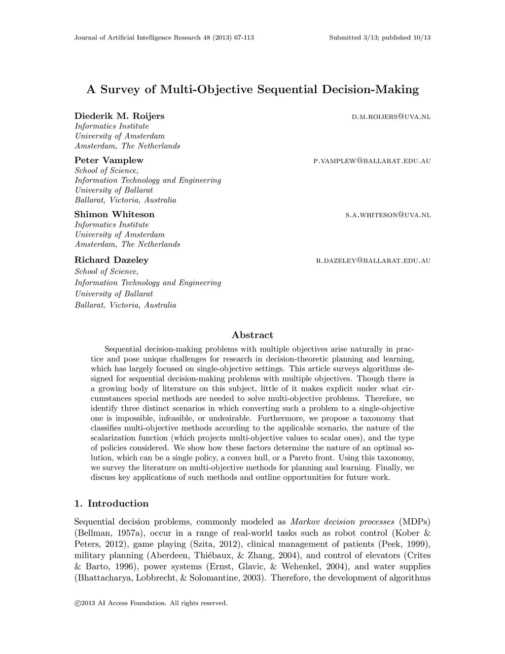Sequential decision-making problems with multiple objectives arise naturally in practice and pose unique challenges for research in decision-theoretic planning and learning, which has largely focused on single-objective settings. This article surveys algorithms designed for sequential decision-making problems with multiple objectives. Though there is a growing body of literature on this subject, little of it makes explicit under what circumstances special methods are needed to solve multi-objective problems. Therefore, we identify three distinct scenarios in which converting such a problem to a single-objective one is impossible, infeasible, or undesirable. Furthermore, we propose a taxonomy that classifies multi-objective methods according to the applicable scenario, the nature of the scalarization function (which projects multi-objective values to scalar ones), and the type of policies considered. We show how these factors determine the nature of an optimal solution, which can be a single policy, a convex hull, or a Pareto front. Using this taxonomy, we survey the literature on multi-objective methods for planning and learning. Finally, we discuss key applications of such methods and outline opportunities for future work.