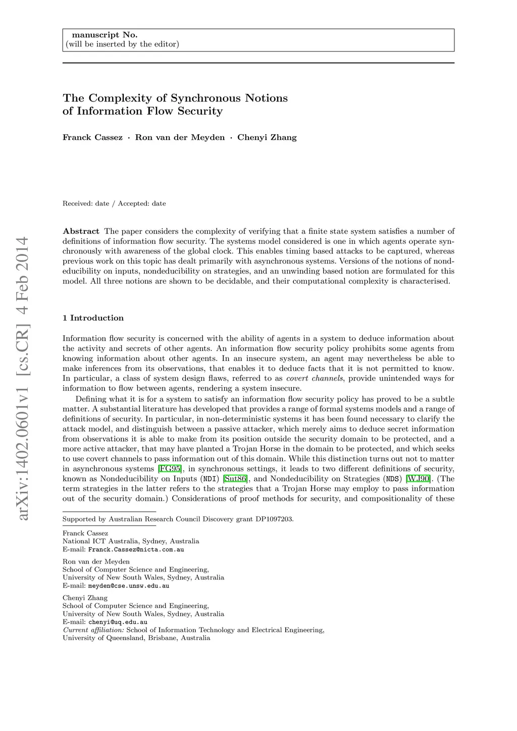 The paper considers the complexity of verifying that a finite state system satisfies a number of definitions of information flow security. The systems model considered is one in which agents operate synchronously with awareness of the global clock. This enables timing based attacks to be captured, whereas previous work on this topic has dealt primarily with asynchronous systems. Versions of the notions of nondeducibility on inputs, nondeducibility on strategies, and an unwinding based notion are formulated for this model. All three notions are shown to be decidable, and their computational complexity is characterised.