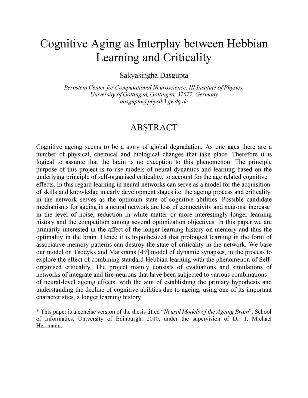 Cognitive ageing seems to be a story of global degradation. As one ages there are a number of physical, chemical and biological changes that take place. Therefore it is logical to assume that the brain is no exception to this phenomenon. The principle purpose of this project is to use models of neural dynamics and learning based on the underlying principle of self-organised criticality, to account for the age related cognitive effects. In this regard learning in neural networks can serve as a model for the acquisition of skills and knowledge in early development stages i.e. the ageing process and criticality in the network serves as the optimum state of cognitive abilities. Possible candidate mechanisms for ageing in a neural network are loss of connectivity and neurons, increase in the level of noise, reduction in white matter or more interestingly longer learning history and the competition among several optimization objectives. In this paper we are primarily interested in the affect of the longer learning history on memory and thus the optimality in the brain. Hence it is hypothesized that prolonged learning in the form of associative memory patterns can destroy the state of criticality in the network. We base our model on Tsodyks and Markrams [49] model of dynamic synapses, in the process to explore the effect of combining standard Hebbian learning with the phenomenon of Self-organised criticality. The project mainly consists of evaluations and simulations of networks of integrate and fire-neurons that have been subjected to various combinations of neural-level ageing effects, with the aim of establishing the primary hypothesis and understanding the decline of cognitive abilities due to ageing, using one of its important characteristics, a longer learning history.