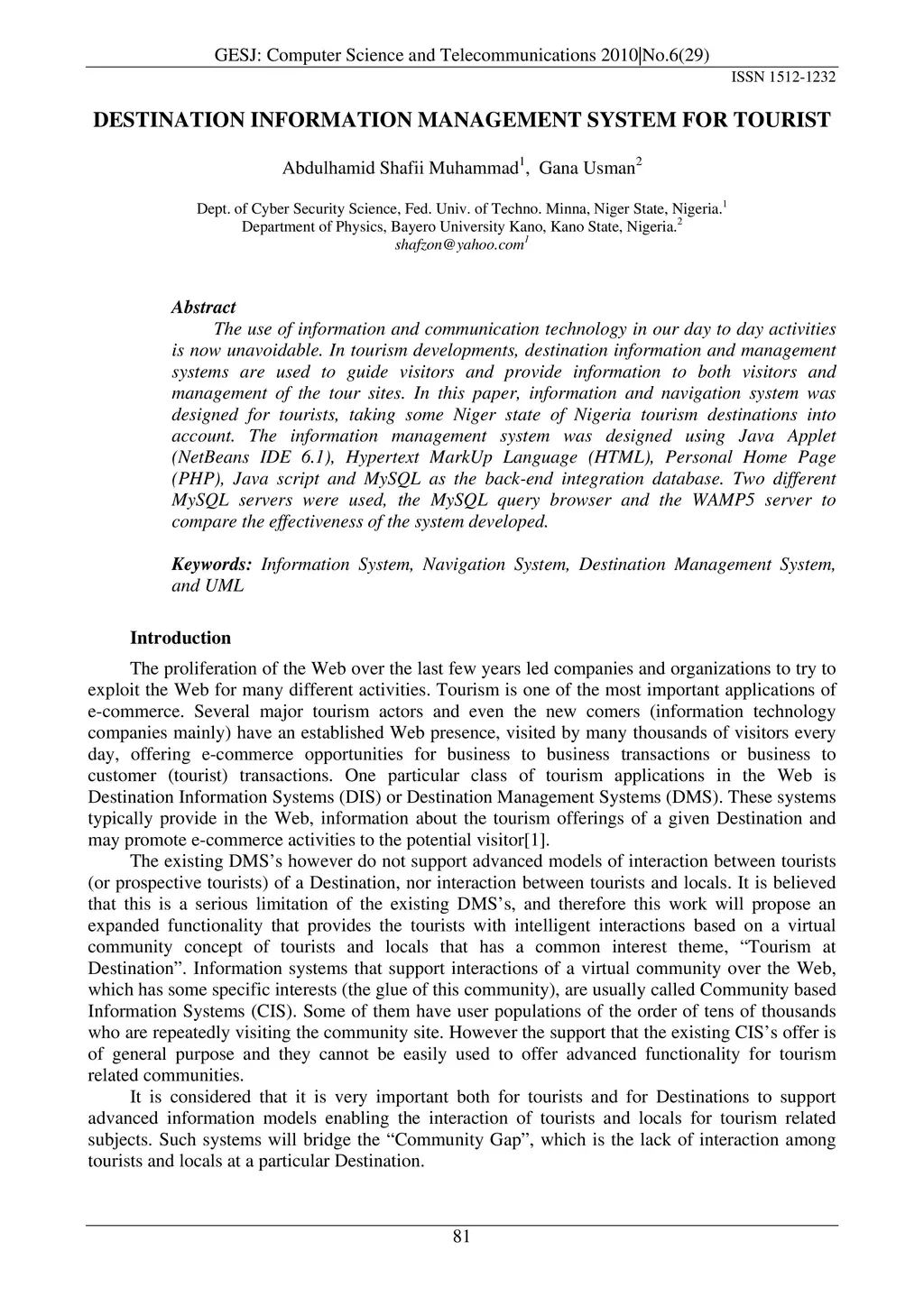 The use of information and communication technology in our day to day activities is now unavoidable. In tourism developments, destination information and management systems are used to guide visitors and provide information to both visitors and management of the tour sites. In this paper, information and navigation system was designed for tourists, taking some Niger state of Nigeria tourism destinations into account. The information management system was designed using Java Applet (NetBeans IDE 6.1), Hypertext MarkUp Language (HTML), Personal Home Page (PHP), Java script and MySQL as the back-end integration database. Two different MySQL servers were used, the MySQL query browser and the WAMP5 server to compare the effectiveness of the system developed.
