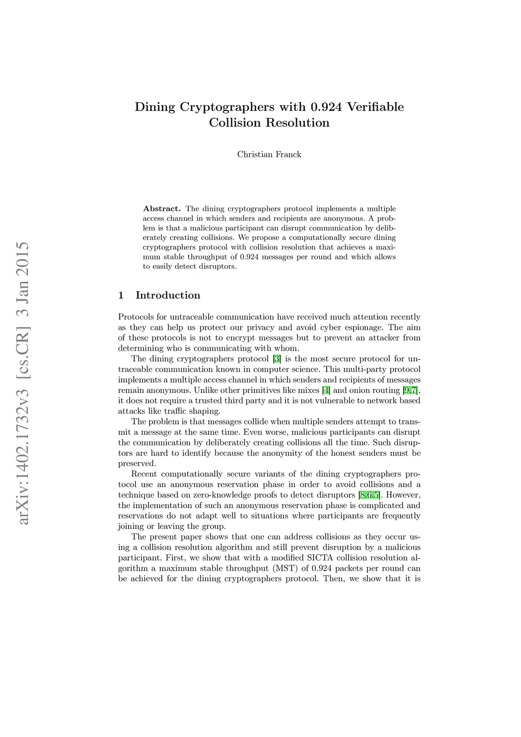 The dining cryptographers protocol implements a multiple access channel in which senders and recipients are anonymous. A problem is that a malicious participant can disrupt communication by deliberately creating collisions. We propose a computationally secure dining cryptographers protocol with collision resolution that achieves a maximum stable throughput of 0.924 messages per round and which allows to easily detect disruptors.