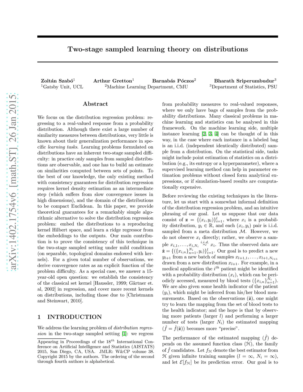 We study the distribution regression problem: regressing to a real-valued response from a probability distribution. Due to the inherent two-stage sampled difficulty of this important machine learning problem---in practise we only have samples from sampled distributions---very little is known about its theoretical properties. In this paper, we propose an algorithmically simple approach to tackle the distribution regression problem: embed the distributions to a reproducing kernel Hilbert space, and learn a ridge regressor from the embeddings to the outputs. Our main contribution is to prove that this technique is consistent in the two-stage sampled setting under fairly mild conditions (for probability distributions on locally compact Polish spaces on which kernels have been defined). The method gives state-of-the-art results on (i) supervised entropy learning and (ii) the prediction problem of aerosol optical depth based on satellite images.