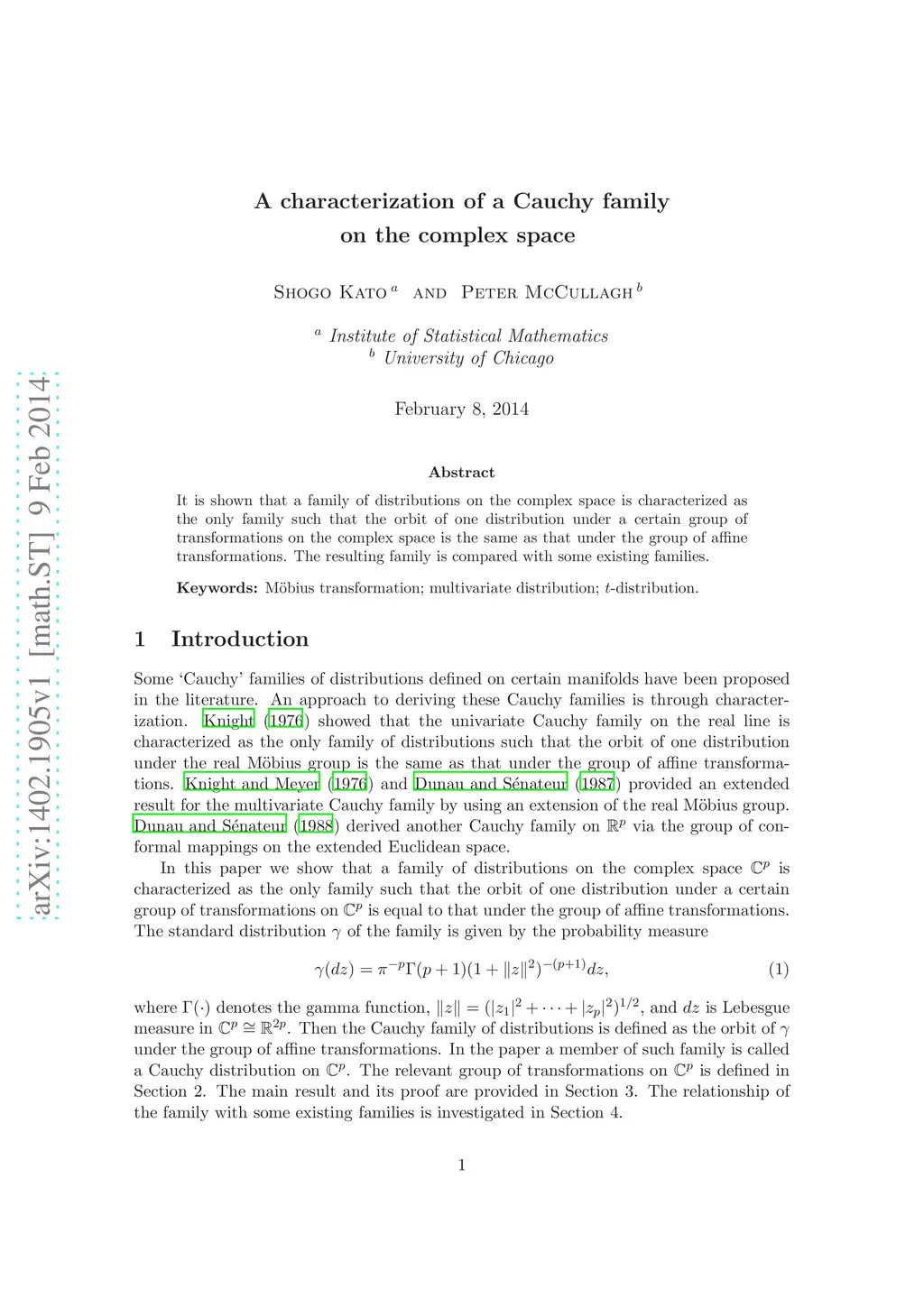 It is shown that a family of distributions on the complex space is characterized as the only family such that the orbit of one distribution under a certain group of transformations on the complex space is the same as that under the group of affine transformations. The resulting family is compared with some existing families.