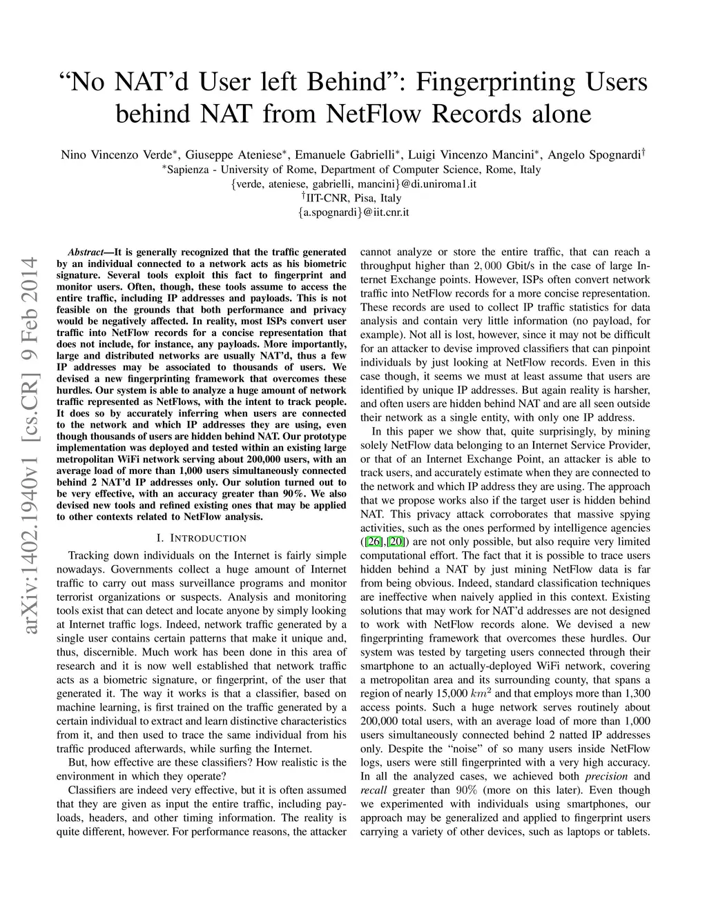 It is generally recognized that the traffic generated by an individual connected to a network acts as his biometric signature. Several tools exploit this fact to fingerprint and monitor users. Often, though, these tools assume to access the entire traffic, including IP addresses and payloads. This is not feasible on the grounds that both performance and privacy would be negatively affected. In reality, most ISPs convert user traffic into NetFlow records for a concise representation that does not include, for instance, any payloads. More importantly, large and distributed networks are usually NAT'd, thus a few IP addresses may be associated to thousands of users. We devised a new fingerprinting framework that overcomes these hurdles. Our system is able to analyze a huge amount of network traffic represented as NetFlows, with the intent to track people. It does so by accurately inferring when users are connected to the network and which IP addresses they are using, even though thousands of users are hidden behind NAT. Our prototype implementation was deployed and tested within an existing large metropolitan WiFi network serving about 200,000 users, with an average load of more than 1,000 users simultaneously connected behind 2 NAT'd IP addresses only. Our solution turned out to be very effective, with an accuracy greater than 90%. We also devised new tools and refined existing ones that may be applied to other contexts related to NetFlow analysis.