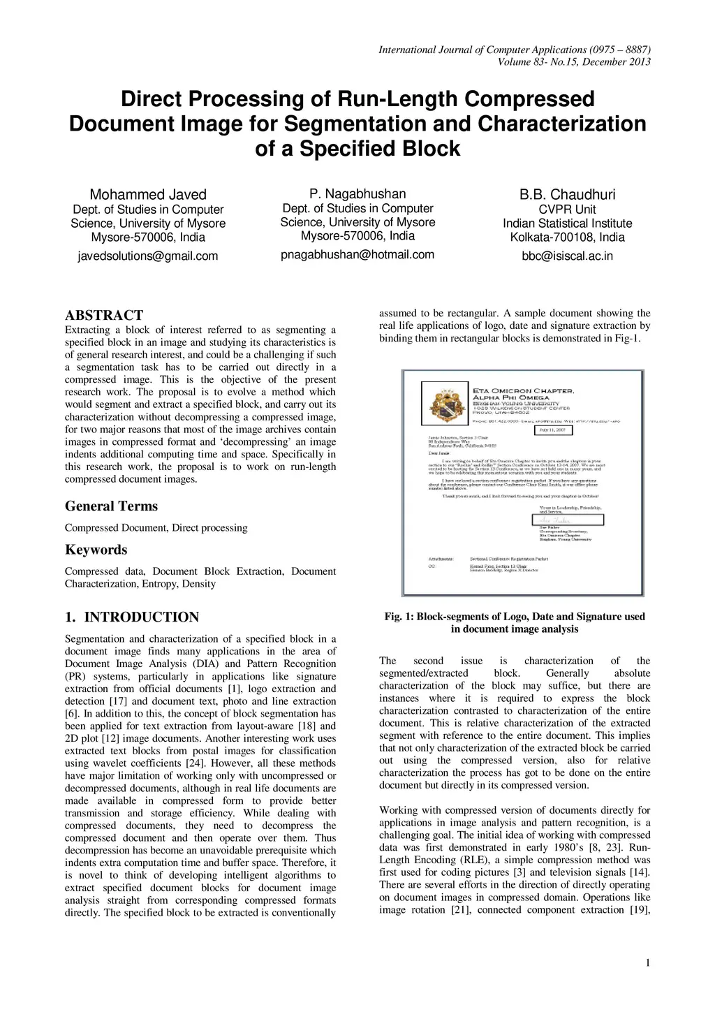 Extracting a block of interest referred to as segmenting a specified block in an image and studying its characteristics is of general research interest, and could be a challenging if such a segmentation task has to be carried out directly in a compressed image. This is the objective of the present research work. The proposal is to evolve a method which would segment and extract a specified block, and carry out its characterization without decompressing a compressed image, for two major reasons that most of the image archives contain images in compressed format and decompressing an image indents additional computing time and space. Specifically in this research work, the proposal is to work on run-length compressed document images.