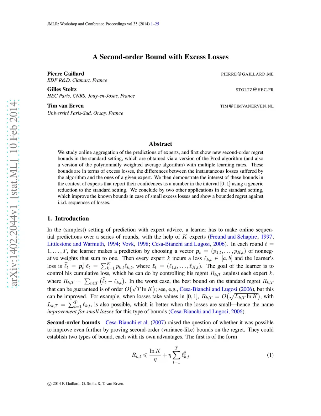 We study online aggregation of the predictions of experts, and first show new second-order regret bounds in the standard setting, which are obtained via a version of the Prod algorithm (and also a version of the polynomially weighted average algorithm) with multiple learning rates. These bounds are in terms of excess losses, the differences between the instantaneous losses suffered by the algorithm and the ones of a given expert. We then demonstrate the interest of these bounds in the context of experts that report their confidences as a number in the interval [0,1] using a generic reduction to the standard setting. We conclude by two other applications in the standard setting, which improve the known bounds in case of small excess losses and show a bounded regret against i.i.d. sequences of losses.