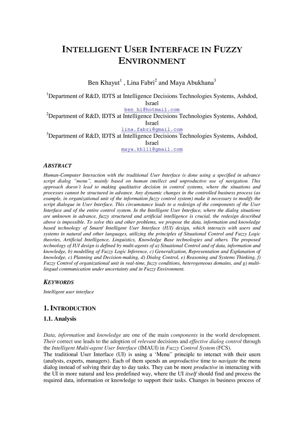 Human-Computer Interaction with the traditional User Interface is done using a specified in advance script dialog menu, mainly based on human intellect and unproductive use of navigation. This approach does not lead to making qualitative decision in control systems, where the situations and processes cannot be structured in advance. Any dynamic changes in the controlled business process (as example, in organizational unit of the information fuzzy control system) make it necessary to modify the script dialogue in User Interface. This circumstance leads to a redesign of the components of the User Interface and of the entire control system. In the Intelligent User Interface, where the dialog situations are unknown in advance, fuzzy structured and artificial intelligence is crucial, the redesign described above is impossible. To solve this and other problems, we propose the data, information and knowledge based technology of Smart/ Intelligent User Interface (IUI) design, which interacts with users and systems in natural and other languages, utilizing the principles of Situational Control and Fuzzy Logic theories, Artificial Intelligence, Linguistics, Knowledge Base technologies and others. The proposed technology of IUI design is defined by multi-agents of Situational Control and of data, information and knowledge, modelling of Fuzzy Logic Inference, Generalization, Representation and Explanation of knowledge, Planning and Decision-making, Dialog Control, Reasoning and Systems Thinking, Fuzzy Control of organizational unit in real-time, fuzzy conditions, heterogeneous domains, and multi-lingual communication under uncertainty and in Fuzzy Environment.
