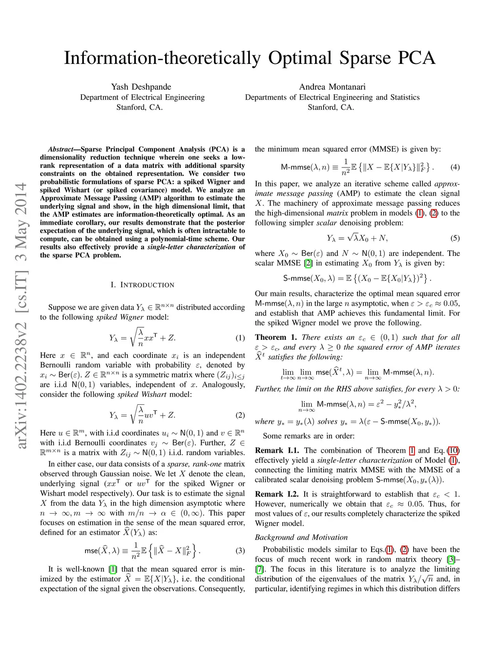 Sparse Principal Component Analysis (PCA) is a dimensionality reduction technique wherein one seeks a low-rank representation of a data matrix with additional sparsity constraints on the obtained representation. We consider two probabilistic formulations of sparse PCA: a spiked Wigner and spiked Wishart (or spiked covariance) model. We analyze an Approximate Message Passing (AMP) algorithm to estimate the underlying signal and show, in the high dimensional limit, that the AMP estimates are information-theoretically optimal. As an immediate corollary, our results demonstrate that the posterior expectation of the underlying signal, which is often intractable to compute, can be obtained using a polynomial-time scheme. Our results also effectively provide a single-letter characterization of the sparse PCA problem.