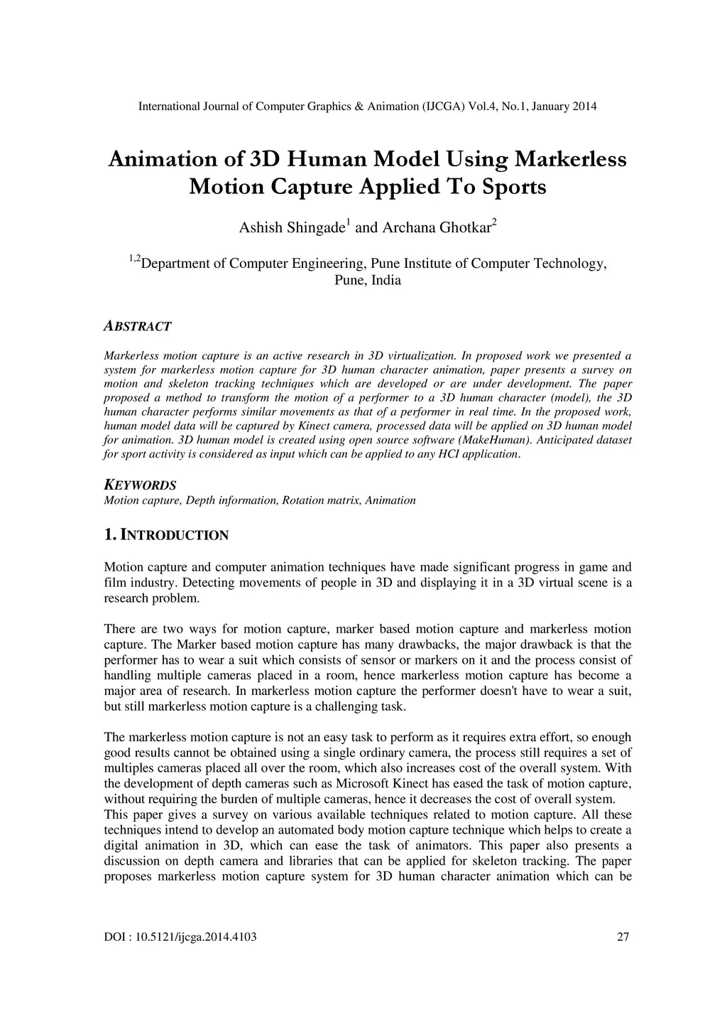 Animation of 3D Human Model Using Markerless Motion Capture Applied To