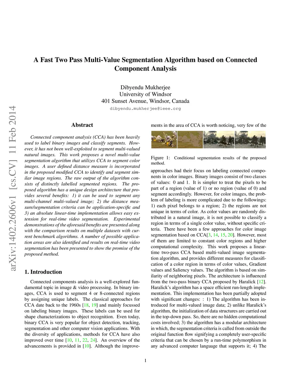 Connected component analysis (CCA) has been heavily used to label binary images and classify segments. However, it has not been well-exploited to segment multi-valued natural images. This work proposes a novel multi-value segmentation algorithm that utilizes CCA to segment color images. A user defined distance measure is incorporated in the proposed modified CCA to identify and segment similar image regions. The raw output of the algorithm consists of distinctly labelled segmented regions. The proposed algorithm has a unique design architecture that provides several benefits: 1) it can be used to segment any multi-channel multi-valued image; 2) the distance measure/segmentation criteria can be application-specific and 3) an absolute linear-time implementation allows easy extension for real-time video segmentation. Experimental demonstrations of the aforesaid benefits are presented along with the comparison results on multiple datasets with current benchmark algorithms. A number of possible application areas are also identified and results on real-time video segmentation has been presented to show the promise of the proposed method.