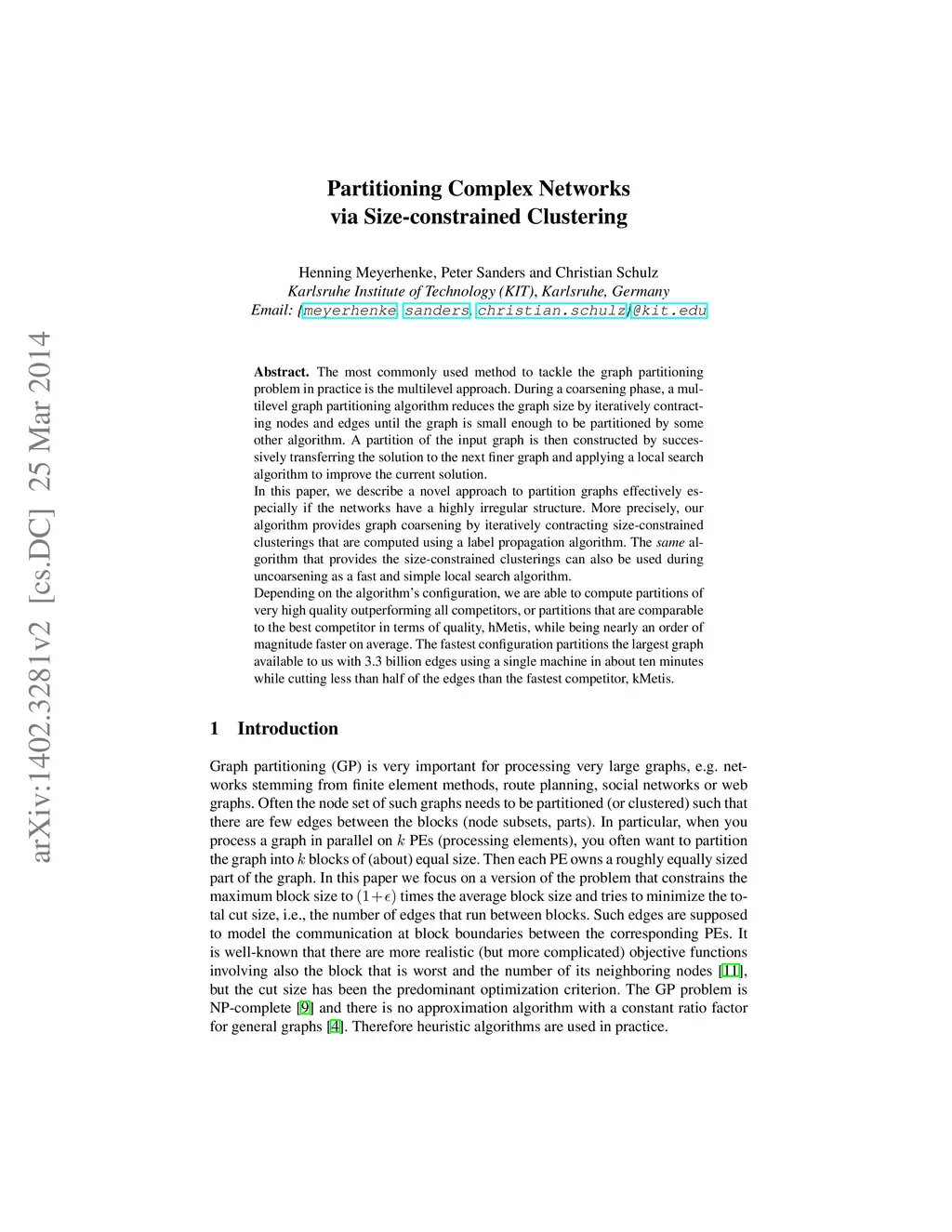 The most commonly used method to tackle the graph partitioning problem in practice is the multilevel approach. During a coarsening phase, a multilevel graph partitioning algorithm reduces the graph size by iteratively contracting nodes and edges until the graph is small enough to be partitioned by some other algorithm. A partition of the input graph is then constructed by successively transferring the solution to the next finer graph and applying a local search algorithm to improve the current solution. In this paper, we describe a novel approach to partition graphs effectively especially if the networks have a highly irregular structure. More precisely, our algorithm provides graph coarsening by iteratively contracting size-constrained clusterings that are computed using a label propagation algorithm. The same algorithm that provides the size-constrained clusterings can also be used during uncoarsening as a fast and simple local search algorithm. Depending on the algorithm's configuration, we are able to compute partitions of very high quality outperforming all competitors, or partitions that are comparable to the best competitor in terms of quality, hMetis, while being nearly an order of magnitude faster on average. The fastest configuration partitions the largest graph available to us with 3.3 billion edges using a single machine in about ten minutes while cutting less than half of the edges than the fastest competitor, kMetis.
