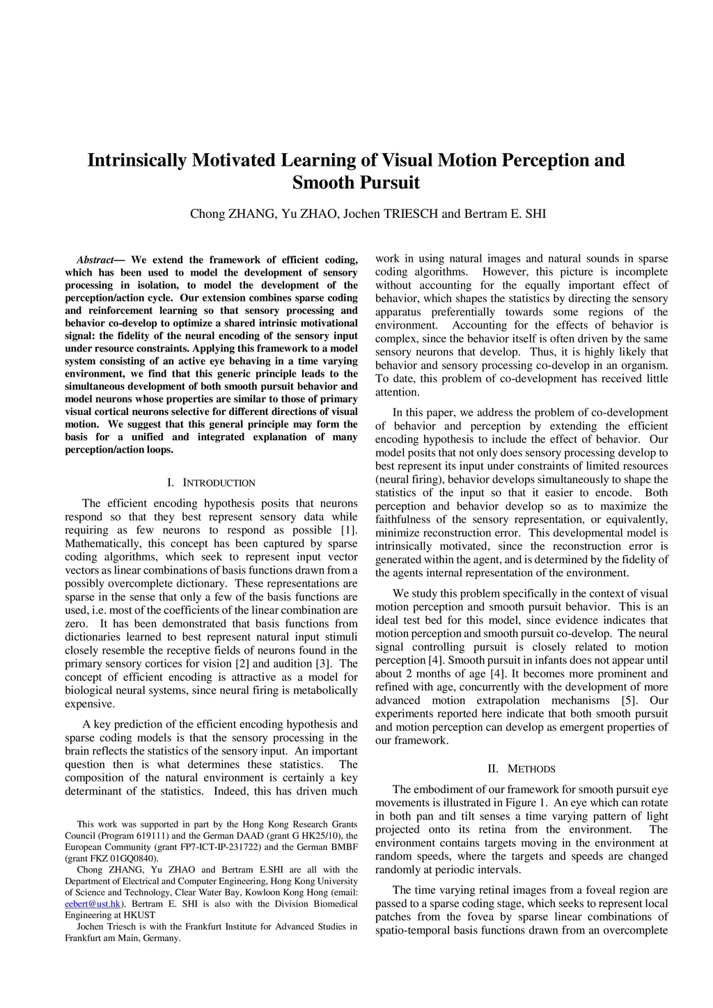 We extend the framework of efficient coding, which has been used to model the development of sensory processing in isolation, to model the development of the perception/action cycle. Our extension combines sparse coding and reinforcement learning so that sensory processing and behavior co-develop to optimize a shared intrinsic motivational signal: the fidelity of the neural encoding of the sensory input under resource constraints. Applying this framework to a model system consisting of an active eye behaving in a time varying environment, we find that this generic principle leads to the simultaneous development of both smooth pursuit behavior and model neurons whose properties are similar to those of primary visual cortical neurons selective for different directions of visual motion. We suggest that this general principle may form the basis for a unified and integrated explanation of many perception/action loops.