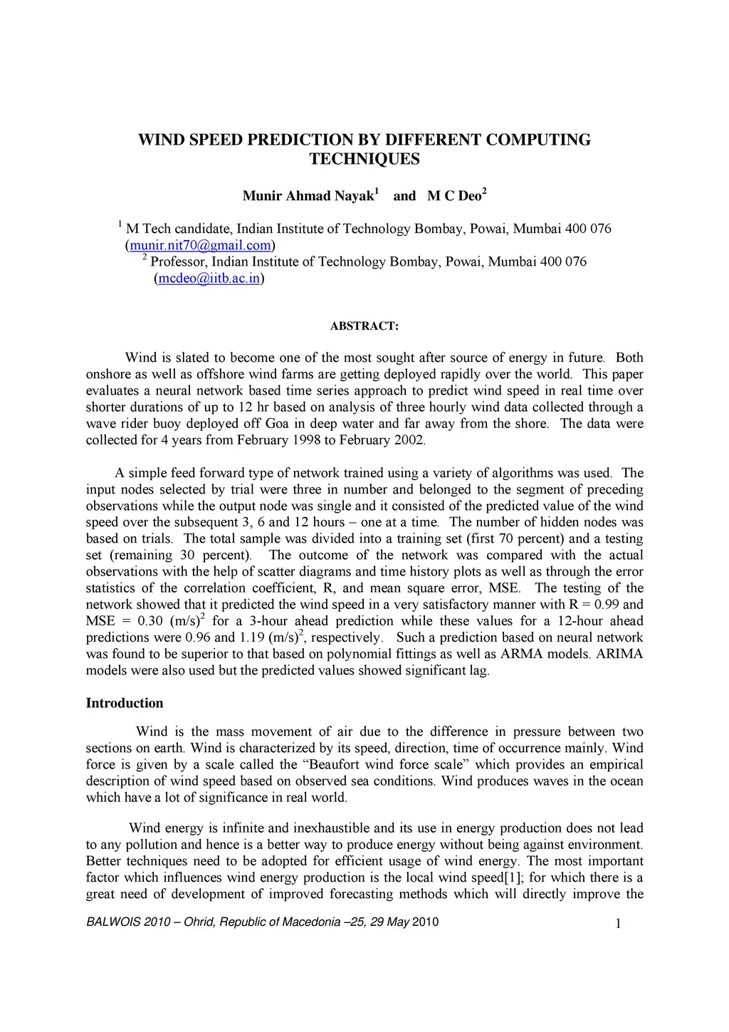 Wind is slated to become one of the most sought after source of energy in future. Both onshore as well as offshore wind farms are getting deployed rapidly over the world. This paper evaluates a neural network based time series approach to predict wind speed in real time over shorter duration of up to 12 hr based on analysis of three hourly wind data collected through a wave rider buoy deployed off Goa in deep water and far away from the shore. The data were collected for 4 years from February 1998 to February 2002. A simple feed forward type of network trained using a variety of algorithms was used. The input nodes selected by trial were three in number and belonged to the segment of preceding observations while the output node was single and it consisted of the predicted value of the wind speed over the subsequent 3, 6 and 12 hours one at a time. The number of hidden nodes was based on trials. The total sample was divided into a training set (first 70 percent) and a testing set (remaining 30 percent). The outcome of the network was compared with the actual observations with the help of scatter diagrams and time history plots as well as through the error statistics of the correlation coefficient, R, and mean square error, MSE. The testing of the network showed that it predicted the wind speed in a very satisfactory manner with R = 0.99 and MSE = 0.30 (m/s)2 for a 3 hour ahead prediction while these values for a 12 hour ahead predictions were 0.96 and 1.19 (m/s)2, respectively. Such a prediction based on neural network was found to be superior to that based on polynomial fittings as well as ARMA models. ARIMA models were also used but the predicted values showed significant lag.