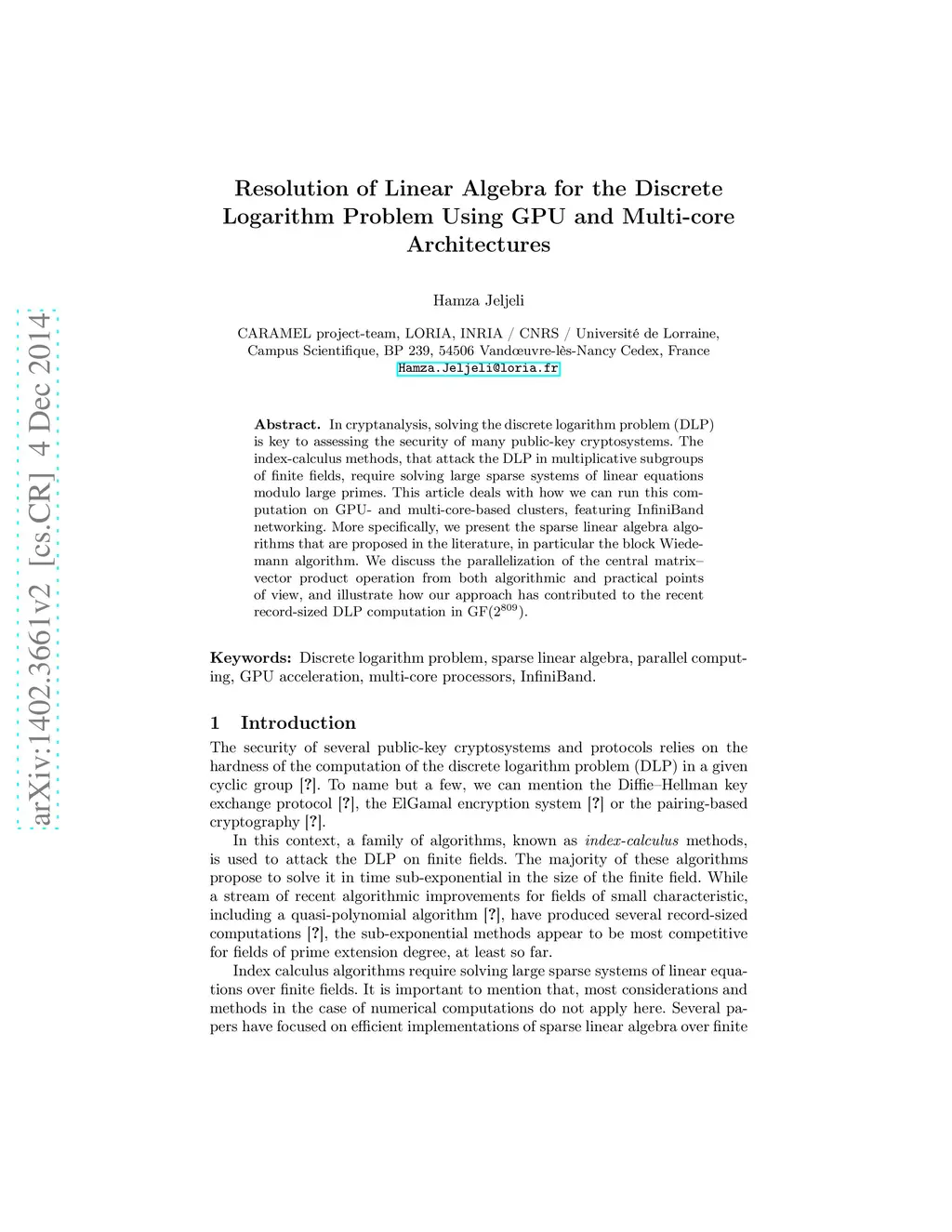 In cryptanalysis, solving the discrete logarithm problem (DLP) is key to assessing the security of many public-key cryptosystems. The index-calculus methods, that attack the DLP in multiplicative subgroups of finite fields, require solving large sparse systems of linear equations modulo large primes. This article deals with how we can run this computation on GPU- and multi-core-based clusters, featuring InfiniBand networking. More specifically, we present the sparse linear algebra algorithms that are proposed in the literature, in particular the block Wiedemann algorithm. We discuss the parallelization of the central matrix--vector product operation from both algorithmic and practical points of view, and illustrate how our approach has contributed to the recent record-sized DLP computation in GF().