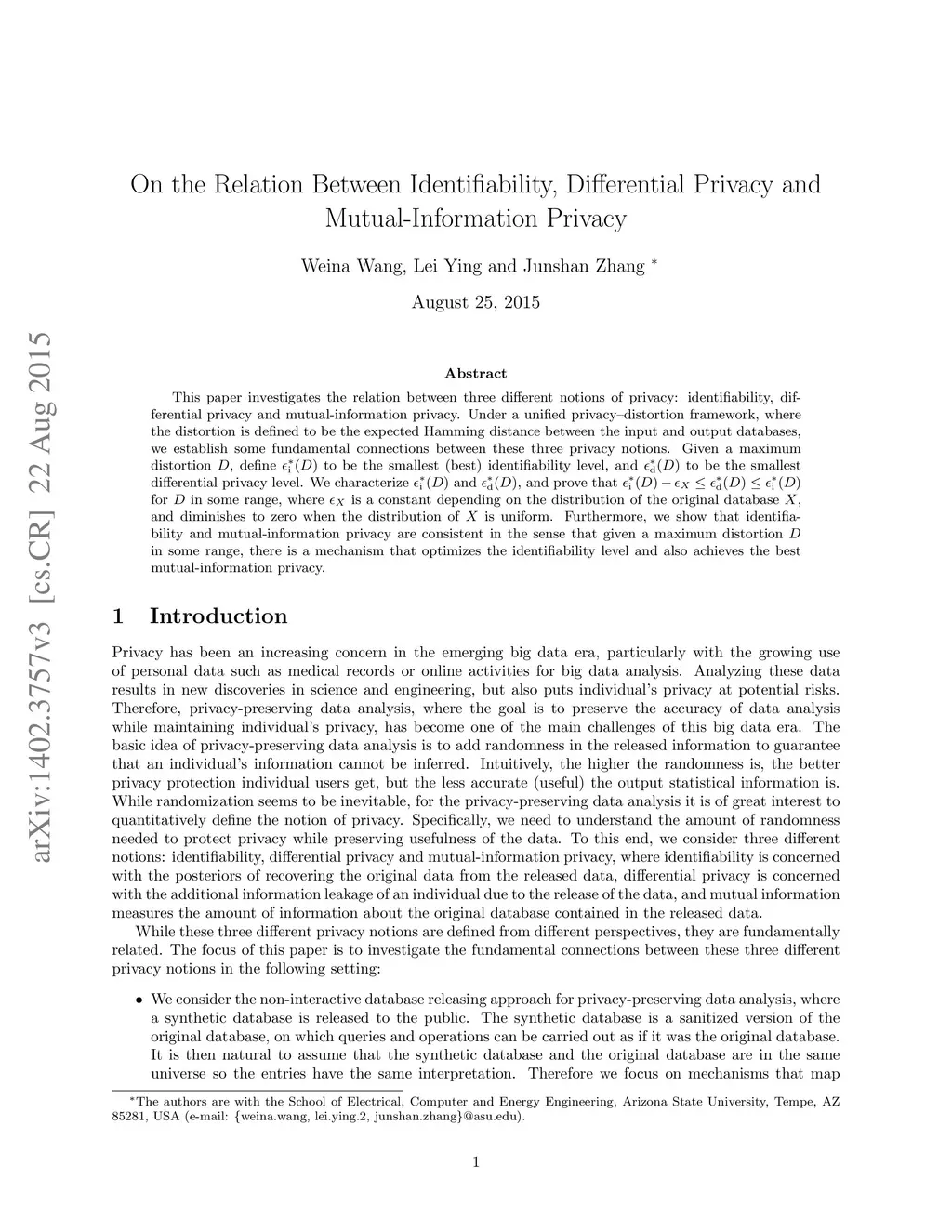 This paper investigates the relation between three different notions of privacy: identifiability, differential privacy and mutual-information privacy. Under a unified privacy-distortion framework, where the distortion is defined to be the Hamming distance of the input and output databases, we establish some fundamental connections between these three privacy notions. Given a distortion level , define to be the smallest (best) identifiability level, and to be the smallest differential privacy level. We characterize and , and prove that for in some range, where is a constant depending on the distribution of the original database , and diminishes to zero when the distribution of is uniform. Furthermore, we show that identifiability and mutual-information privacy are consistent in the sense that given distortion level , the mechanism that optimizes the mutual-information privacy also minimizes the identifiability level.