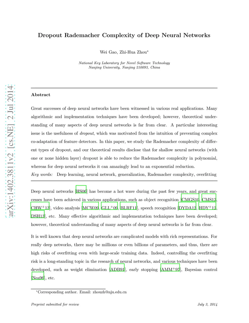 Great successes of deep neural networks have been witnessed in various real applications. Many algorithmic and implementation techniques have been developed, however, theoretical understanding of many aspects of deep neural networks is far from clear. A particular interesting issue is the usefulness of dropout, which was motivated from the intuition of preventing complex co-adaptation of feature detectors. In this paper, we study the Rademacher complexity of different types of dropout, and our theoretical results disclose that for shallow neural networks (with one or none hidden layer) dropout is able to reduce the Rademacher complexity in polynomial, whereas for deep neural networks it can amazingly lead to an exponential reduction of the Rademacher complexity.
