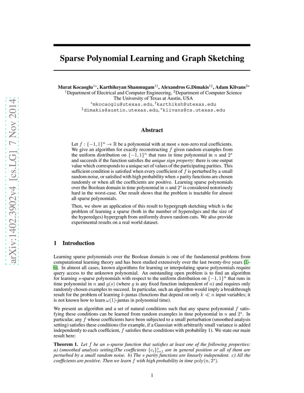 Let be a polynomial with at most non-zero real coefficients. We give an algorithm for exactly reconstructing f given random examples from the uniform distribution on that runs in time polynomial in and and succeeds if the function satisfies the unique sign property: there is one output value which corresponds to a unique set of values of the participating parities. This sufficient condition is satisfied when every coefficient of f is perturbed by a small random noise, or satisfied with high probability when s parity functions are chosen randomly or when all the coefficients are positive. Learning sparse polynomials over the Boolean domain in time polynomial in and is considered notoriously hard in the worst-case. Our result shows that the problem is tractable for almost all sparse polynomials. Then, we show an application of this result to hypergraph sketching which is the problem of learning a sparse (both in the number of hyperedges and the size of the hyperedges) hypergraph from uniformly drawn random cuts. We also provide experimental results on a real world dataset.
