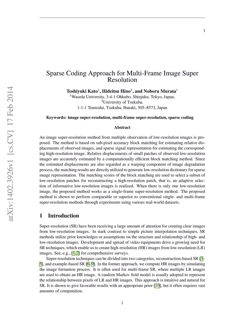 An image super-resolution method from multiple observation of low-resolution images is proposed. The method is based on sub-pixel accuracy block matching for estimating relative displacements of observed images, and sparse signal representation for estimating the corresponding high-resolution image. Relative displacements of small patches of observed low-resolution images are accurately estimated by a computationally efficient block matching method. Since the estimated displacements are also regarded as a warping component of image degradation process, the matching results are directly utilized to generate low-resolution dictionary for sparse image representation. The matching scores of the block matching are used to select a subset of low-resolution patches for reconstructing a high-resolution patch, that is, an adaptive selection of informative low-resolution images is realized. When there is only one low-resolution image, the proposed method works as a single-frame super-resolution method. The proposed method is shown to perform comparable or superior to conventional single- and multi-frame super-resolution methods through experiments using various real-world datasets.