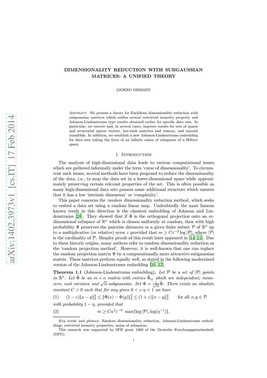 We present a theory for Euclidean dimensionality reduction with subgaussian matrices which unifies several restricted isometry property and Johnson-Lindenstrauss type results obtained earlier for specific data sets. In particular, we recover and, in several cases, improve results for sets of sparse and structured sparse vectors, low-rank matrices and tensors, and smooth manifolds. In addition, we establish a new Johnson-Lindenstrauss embedding for data sets taking the form of an infinite union of subspaces of a Hilbert space.